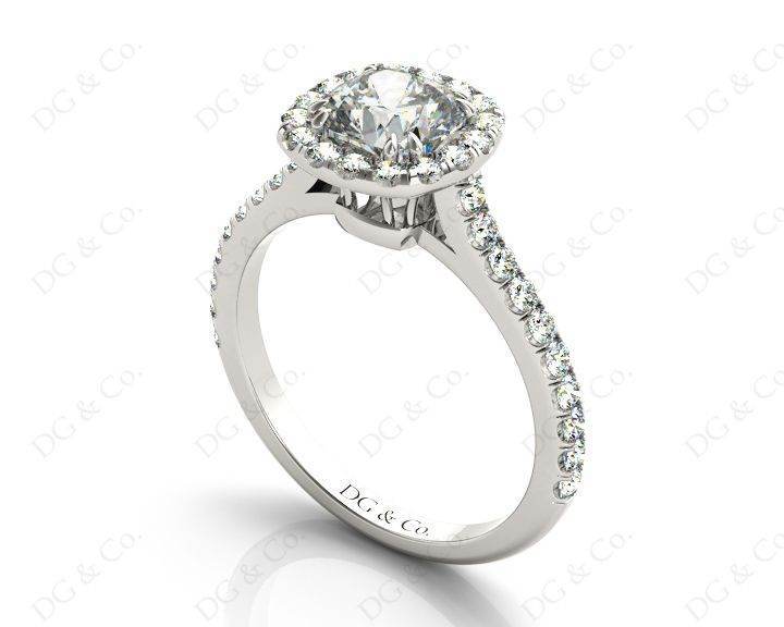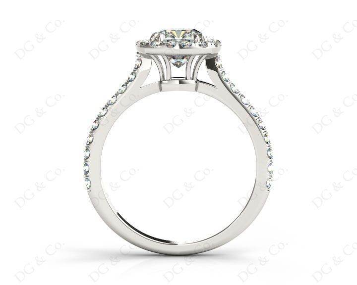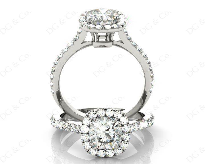 Halo Diamond Engagement Ring with Cushion Cut Diamond in Four Claws Setting with Thirty-six Round Brilliant Pave Set around the Centre Stone and Down the Shoulders.