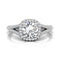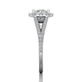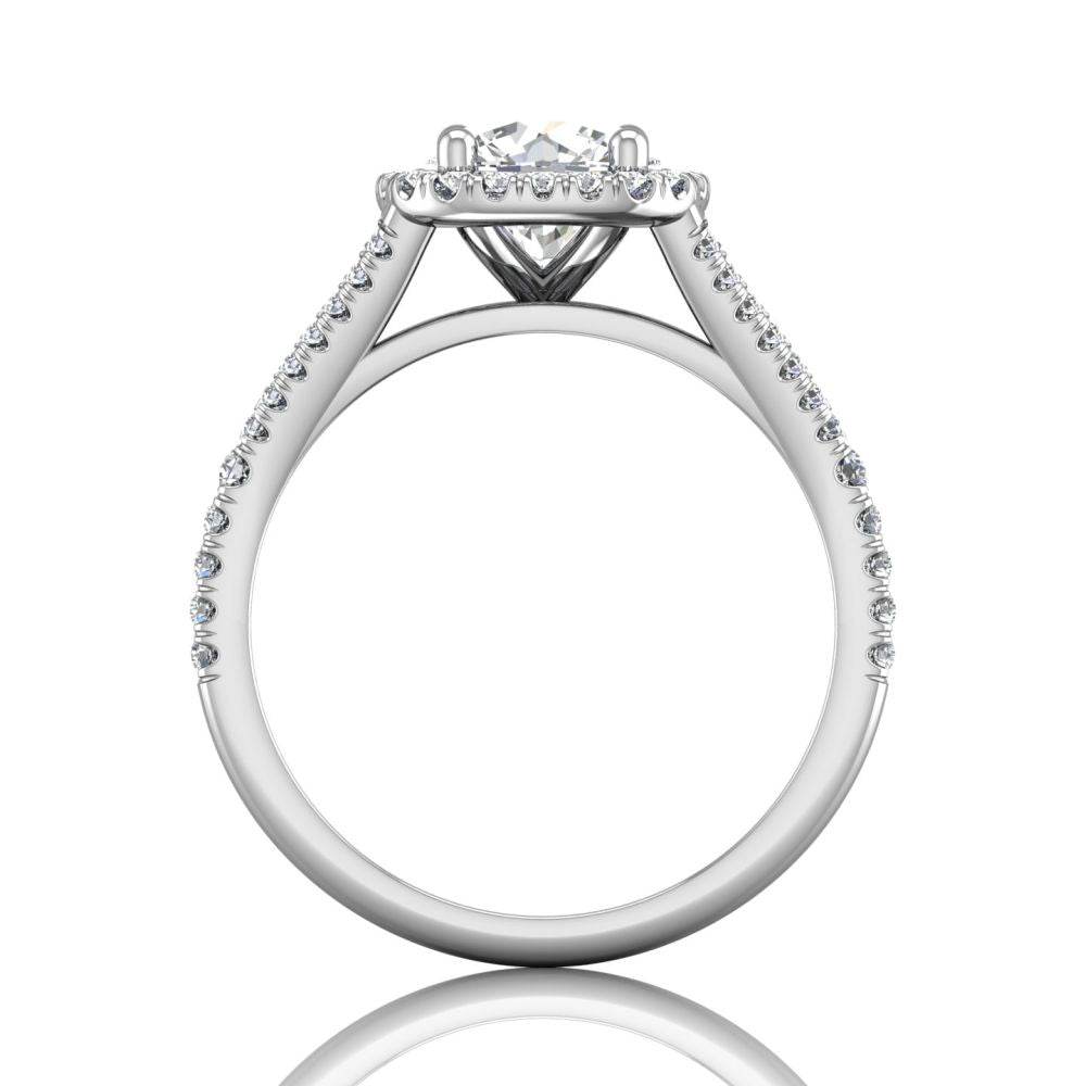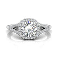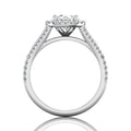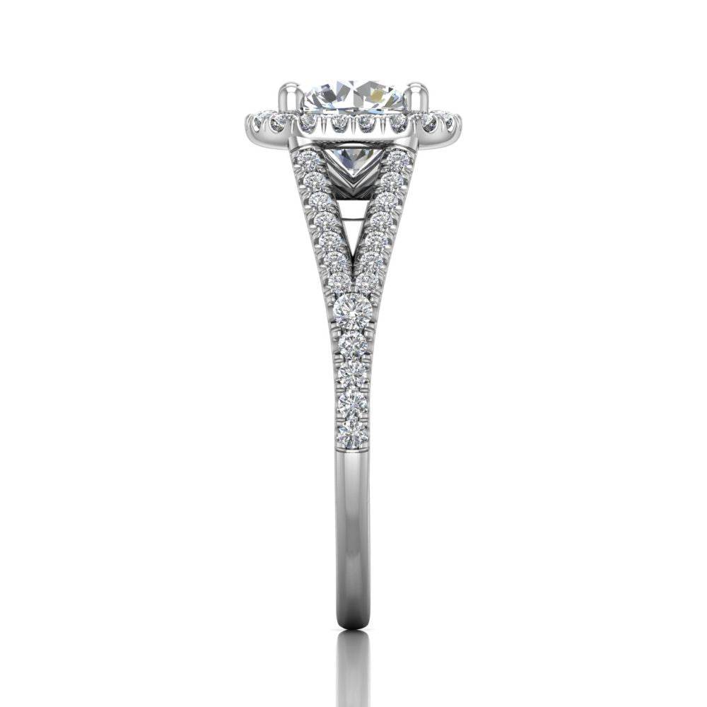 Brilliance defined, this diamond engagement ring features round diamonds set in a split shank and halo cushion design of 18k white gold high raised to fit a wedding band flash next to it.