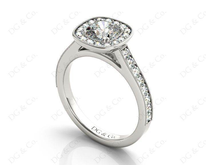Cushion Cut Halo Diamond Ring with Milgrain Prong Set Centre Stone - Platinum