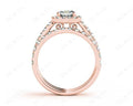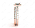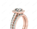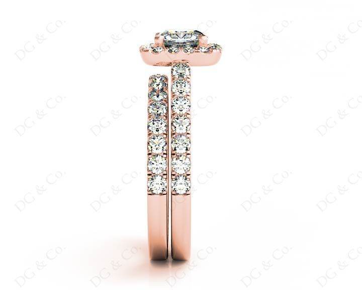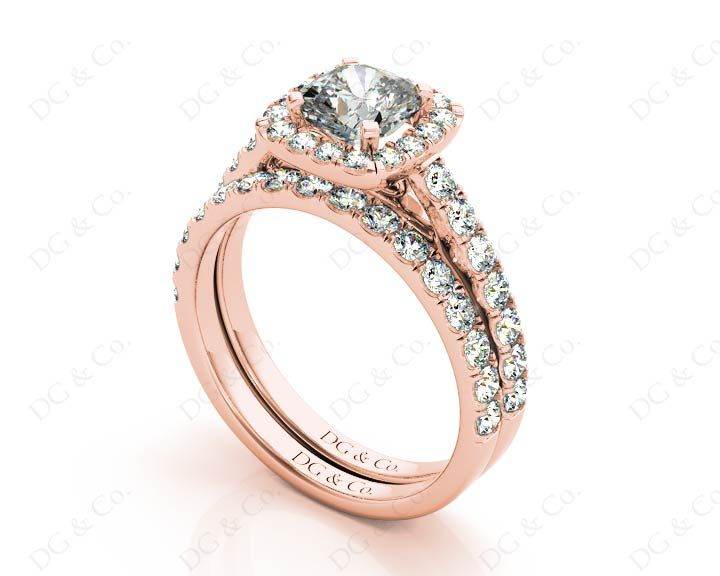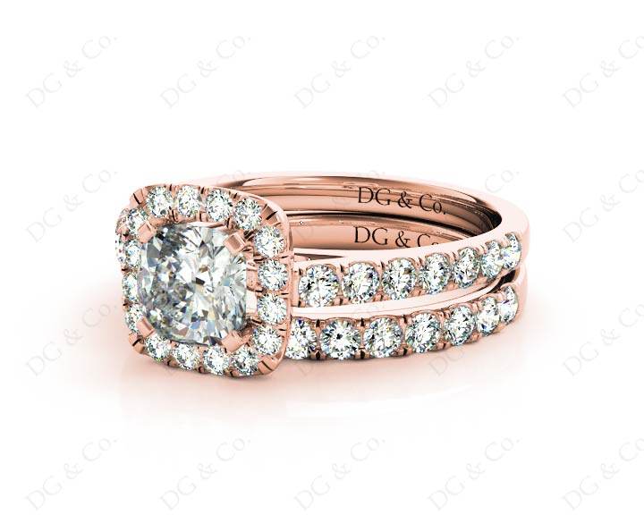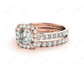 Wedding set rings with cushion cut diamond four claw setting in the centre and forty-six round pave setting around the centre stone and in the wedding band.