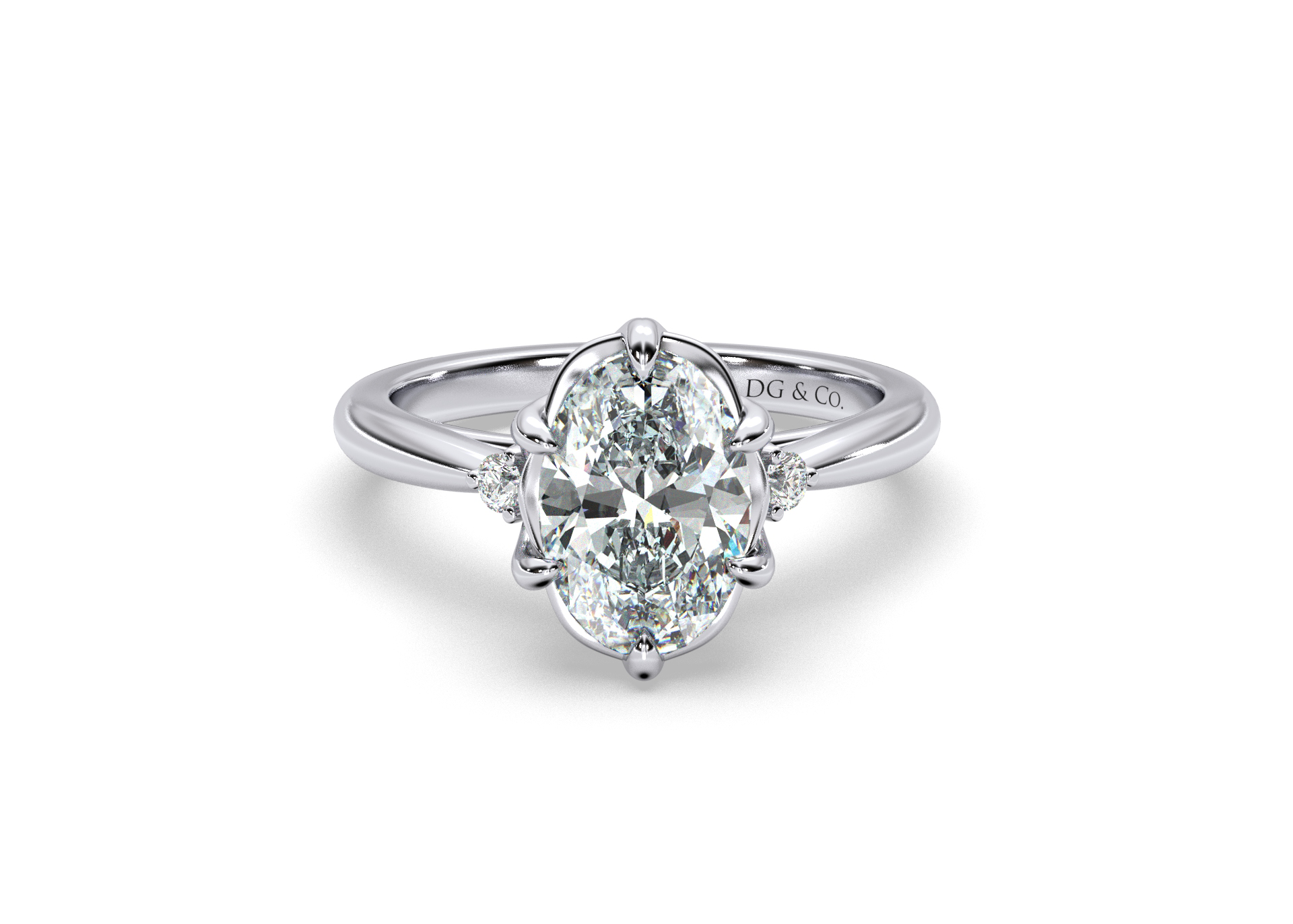 The central focus, a dazzling oval-cut diamond, is cradled in an oval bezel prong head, radiating an aura of sophistication. Flanking this centerpiece, two round brilliant diamonds, each embraced in a four-claw setting.