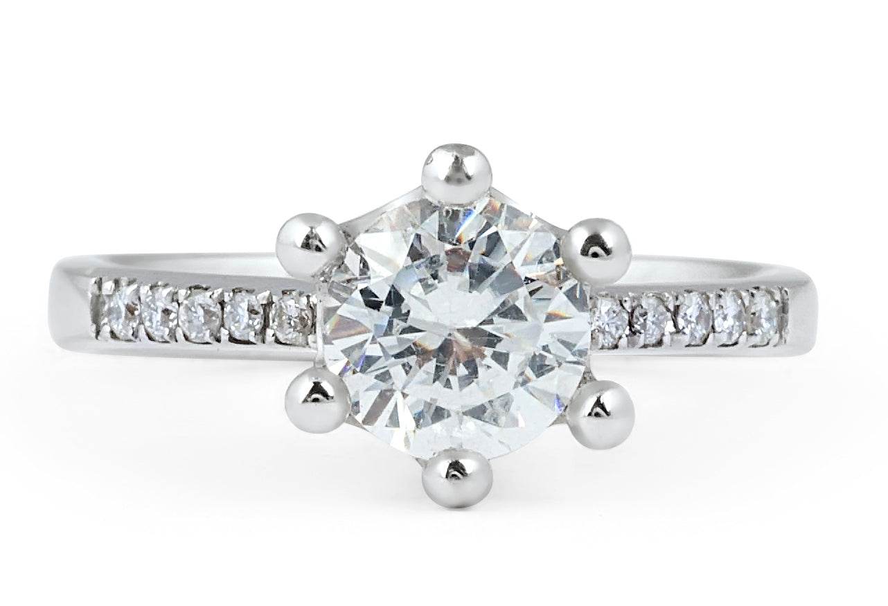 This classic six Claw Crown setting Diamond engagement ring features a 1 carat round diamond centre with a flow of round diamonds on the shank for a total of 0.088 carats.This diamond is 100% Eye Clean.