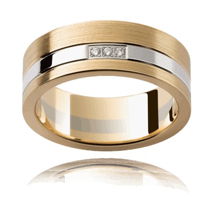 Make your love resonate with this yellow and white gold wedding ring , showcasing a modern brushed and shiny finish with brilliant cut pave setting diamonds.