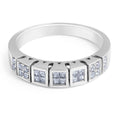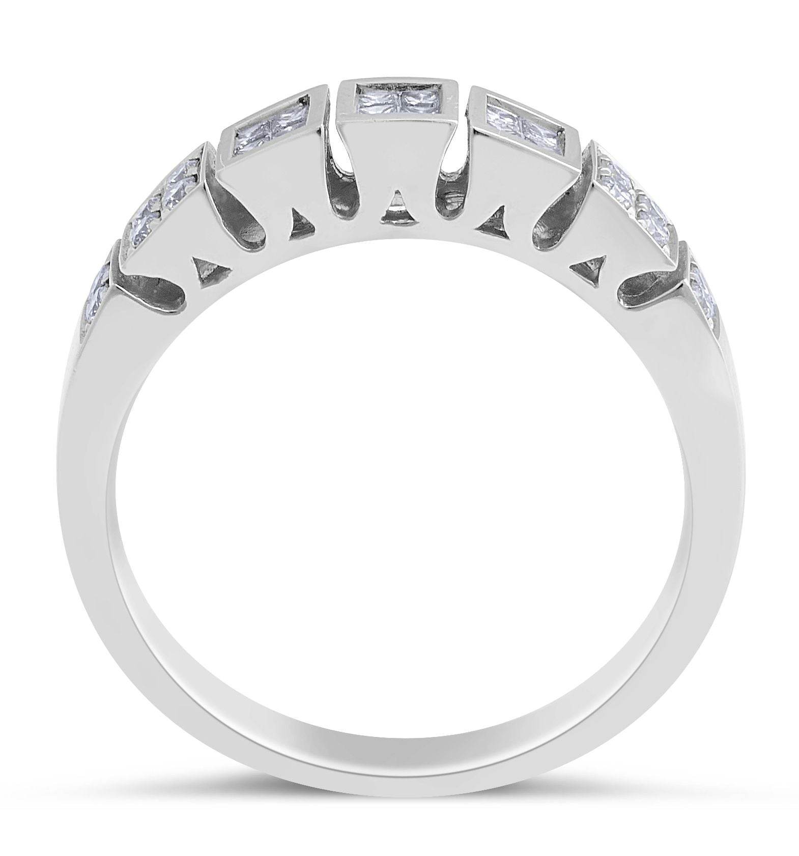 This modern18 Karat white gold diamond wedding band has 12 round and 12 princess diamonds totalling 0.28 Carat in grain and invisible setting sections. This ring is wonderful combined with another ring, as well as a stand-alone piece. The outstanding architectural design of this ring will impress a woman whose style is modern elegance.