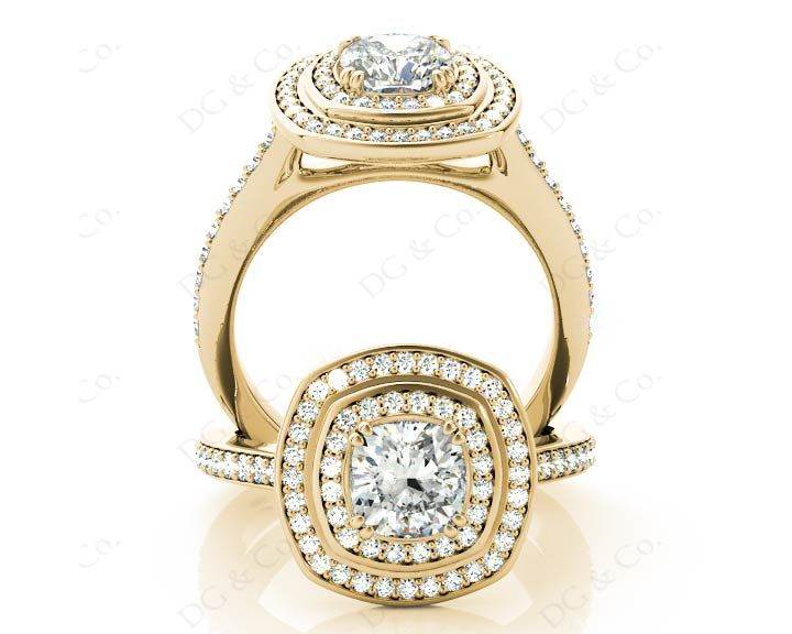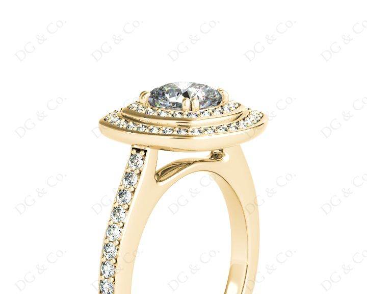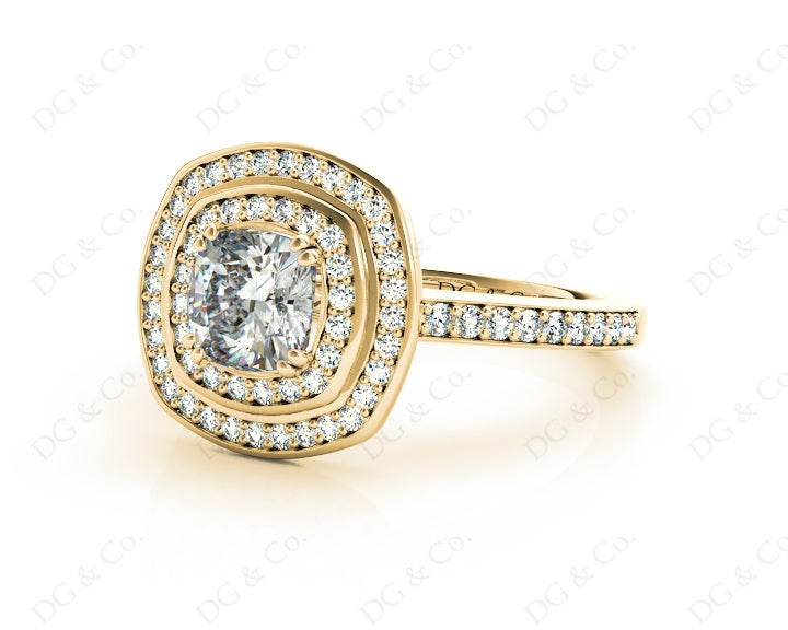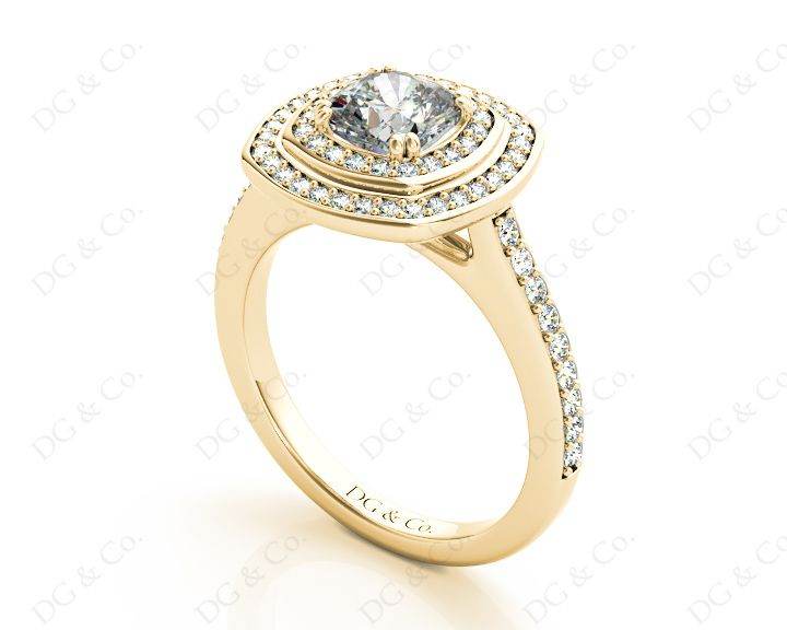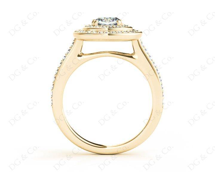 Double Halo Diamond Engagement Ring with a Round Cut Diamond in a Claw Setting Surrounded with Seventy Round Diamonds Channel Share Prong Setting around the Centre Stone and Down the Shoulders.