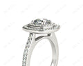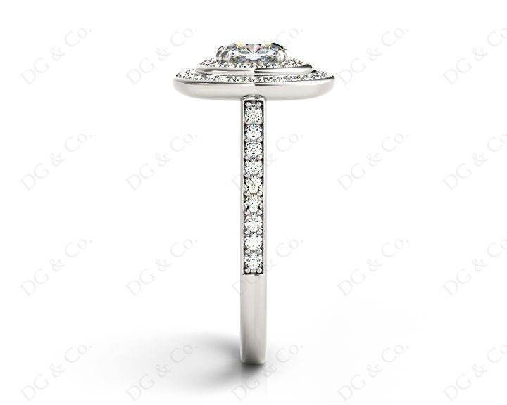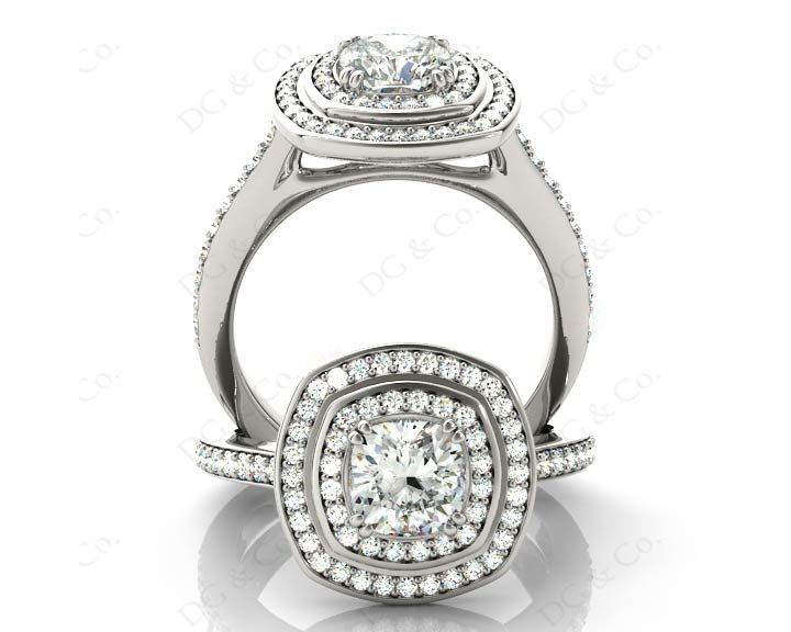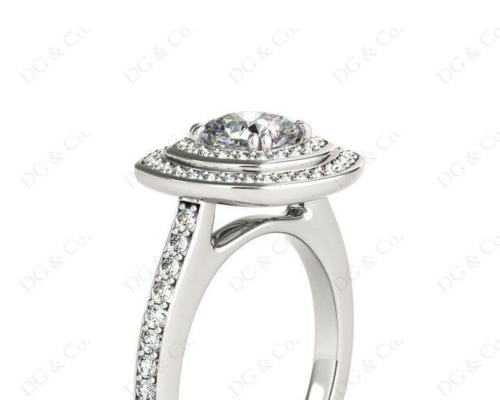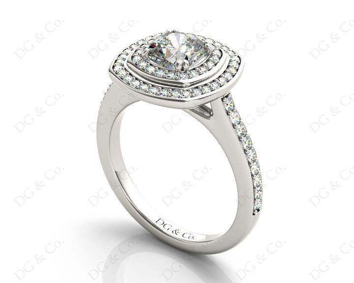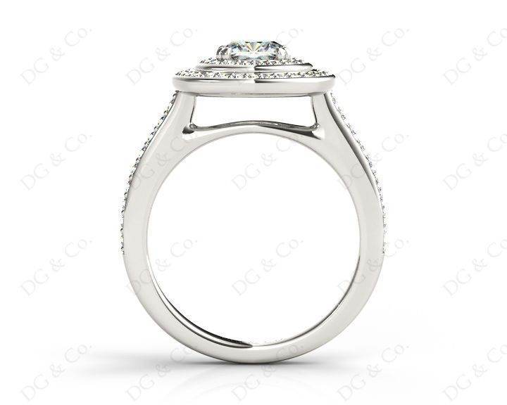 Double Halo Diamond Engagement Ring with a Round Cut Diamond in a Claw Setting Surrounded with Seventy Round Diamonds Channel Share Prong Setting around the Centre Stone and Down the Shoulders.