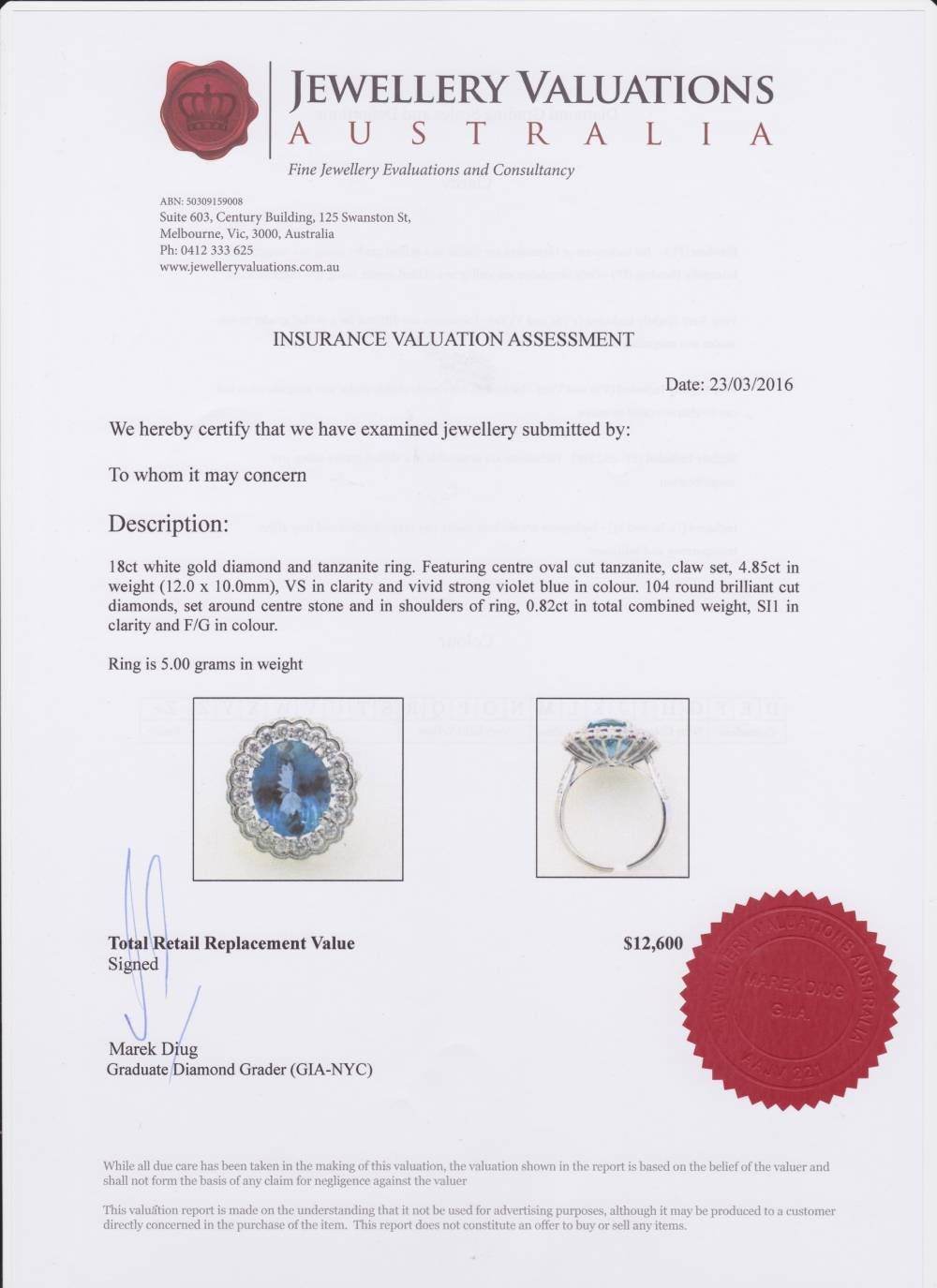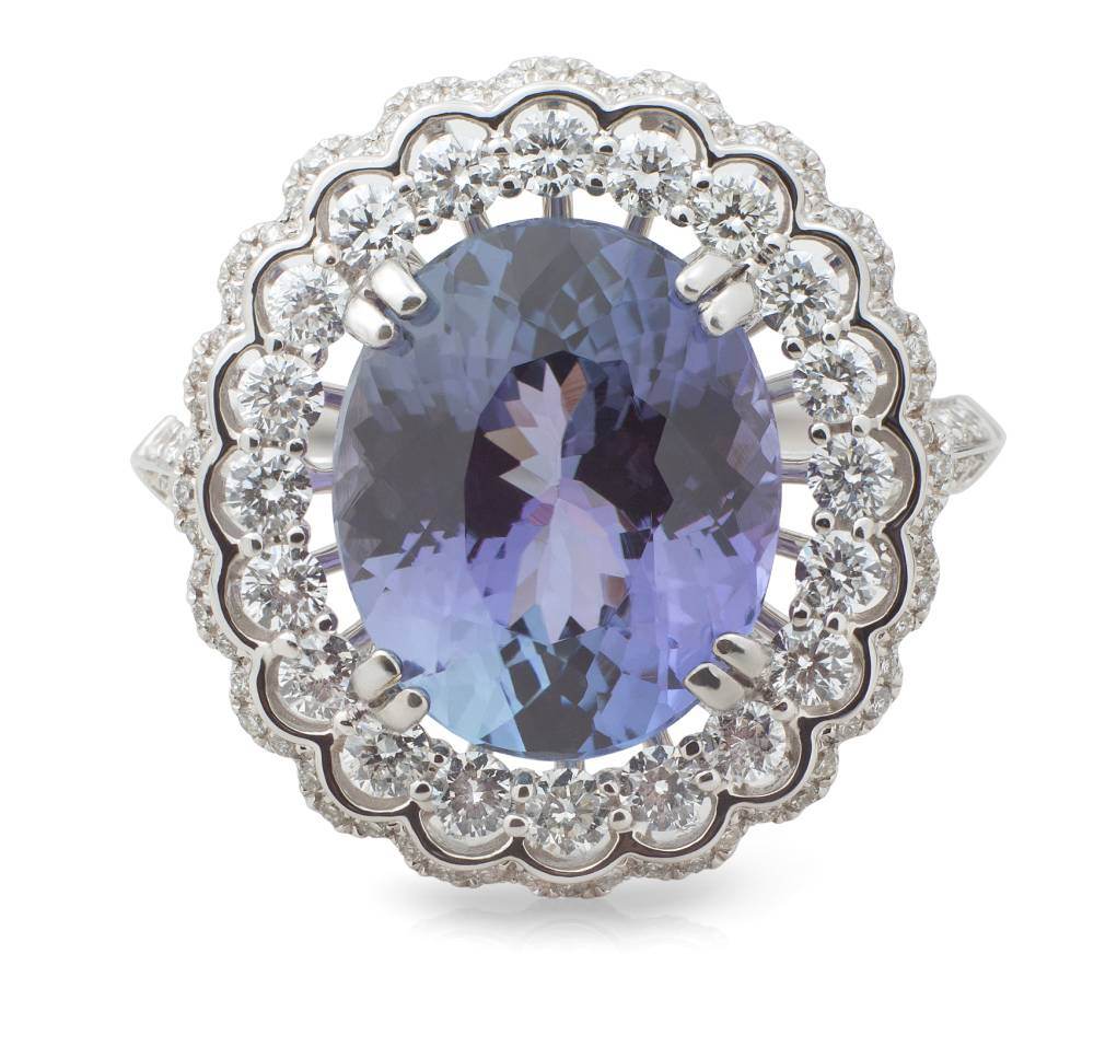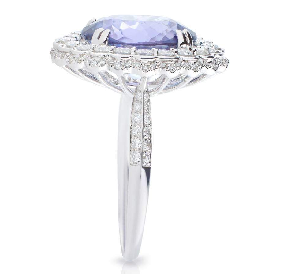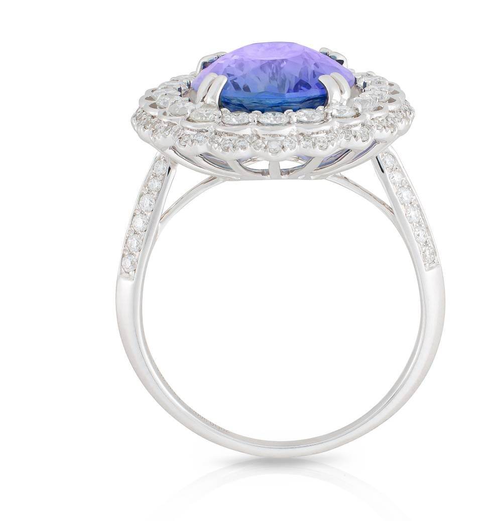 Perfectly stunning, this gemstone and diamond ring features a 4.85 carat oval tanzanite with a double halo of brilliant round diamonds intricately set in 18k white gold.
