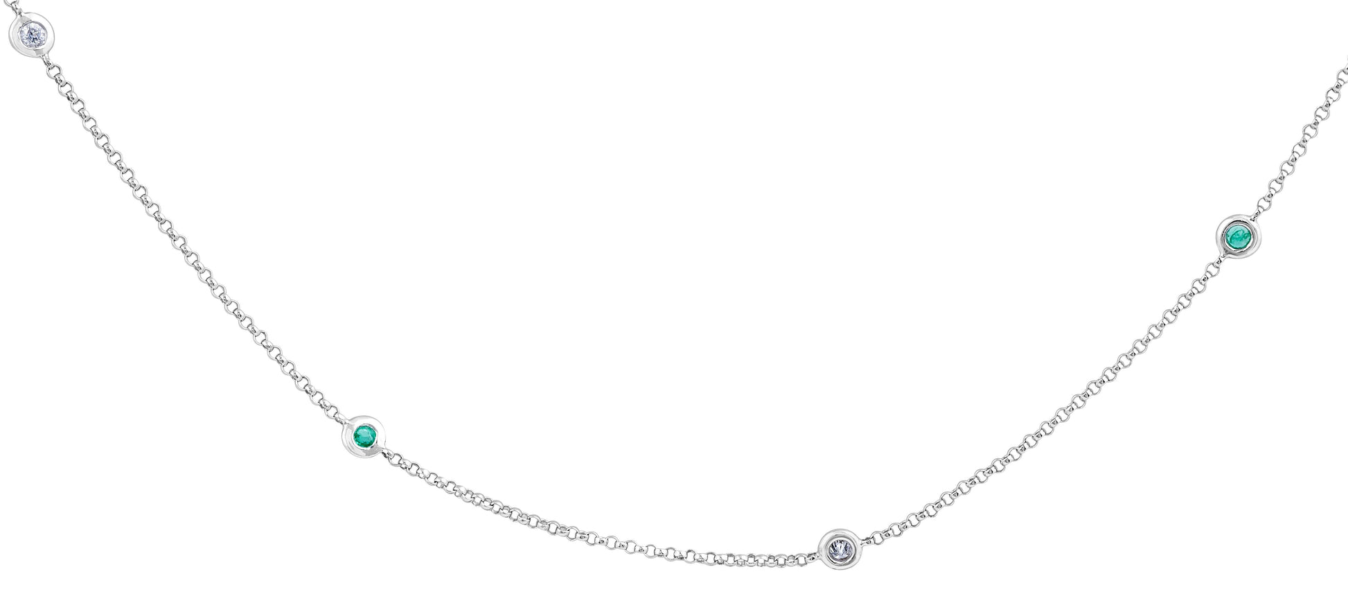 A classic style cable chain with gorgeous bezel set diamonds and emeralds sprinkled on it. An adorable piece of jewellery.