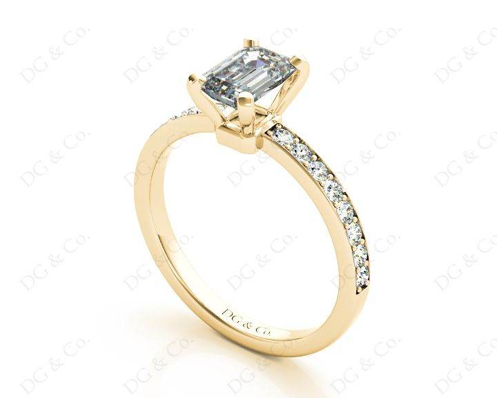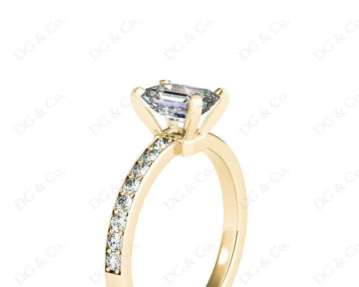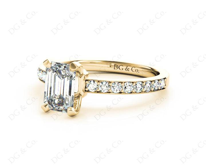 Diamond Engagement Ring with Emerald cut diamond in Four Prong Setting with sixteen Round Brilliant Pave Setting Down in to the Shoulders.