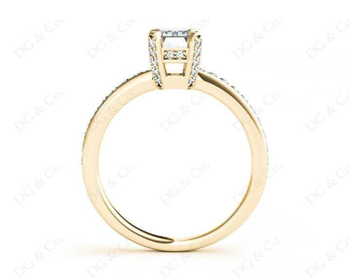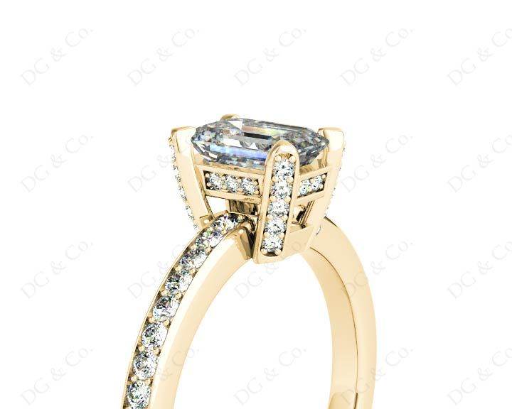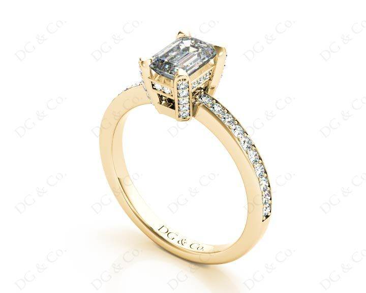 Engagement ring with a emerald cut diamond in a four claw setting and fifty brilliant cut diamonds grain set into the shoulders.