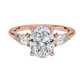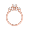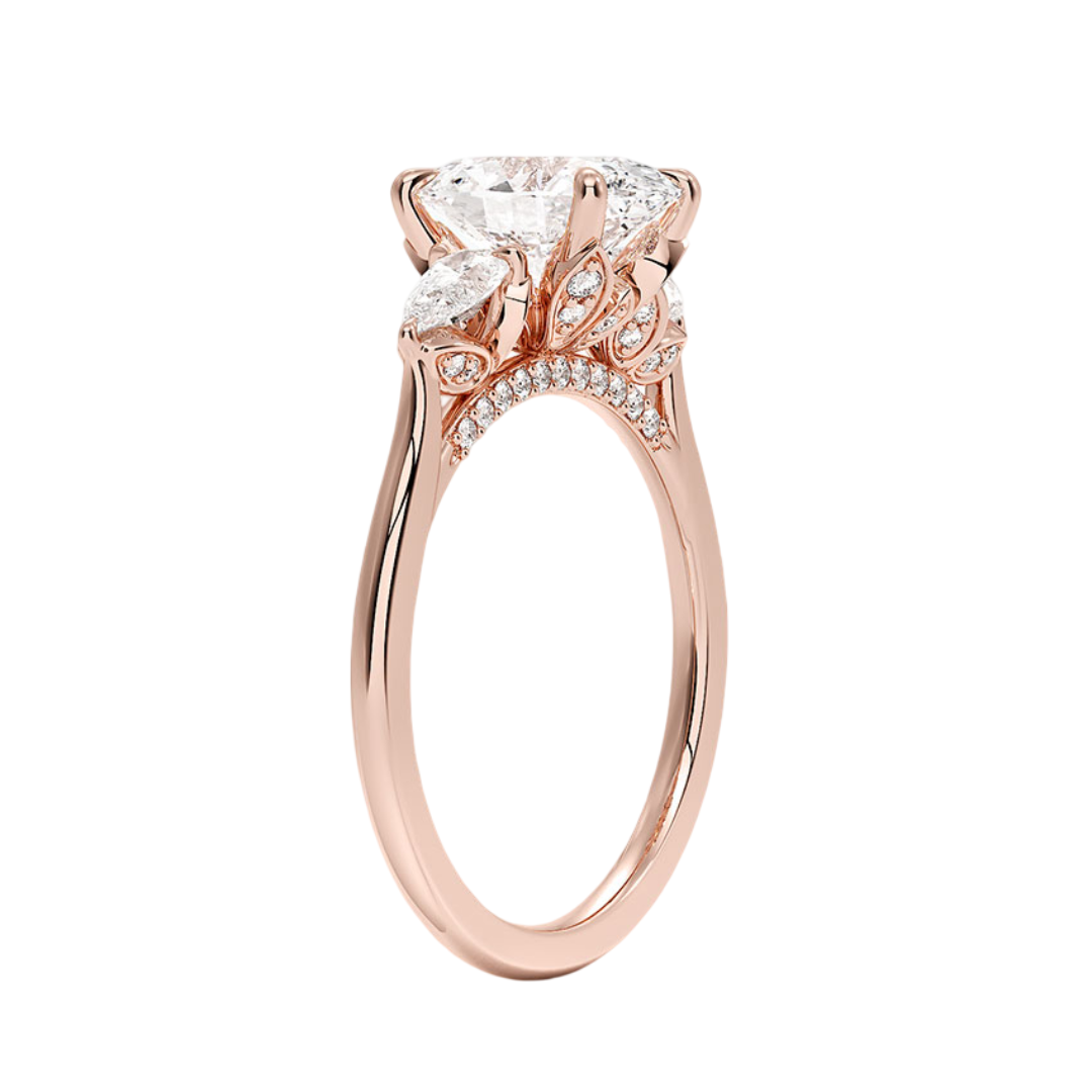 Celebrate timeless romance with this elegantly crafted engagement ring, featuring a breathtaking Oval Cut lab-grown diamond at its center. Flanked by two luminous Pear Cut diamonds, this design exudes both classic sophistication and modern charm. A delicate hidden halo wraps gracefully around the base of the center stone, enhancing its brilliance with a subtle shimmer. Expertly set in warm 18K rose gold, this piece embodies refined luxury and eternal love.