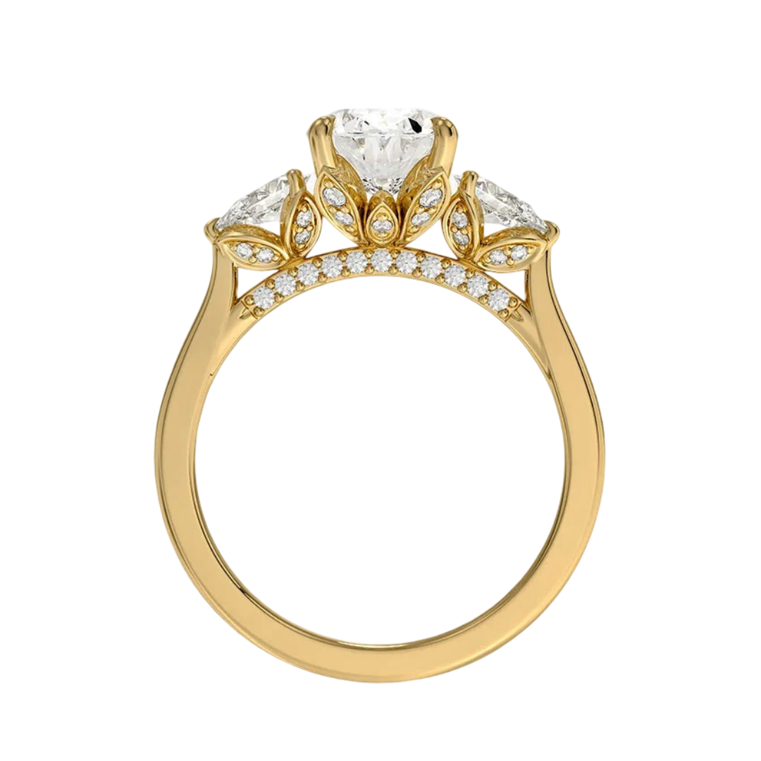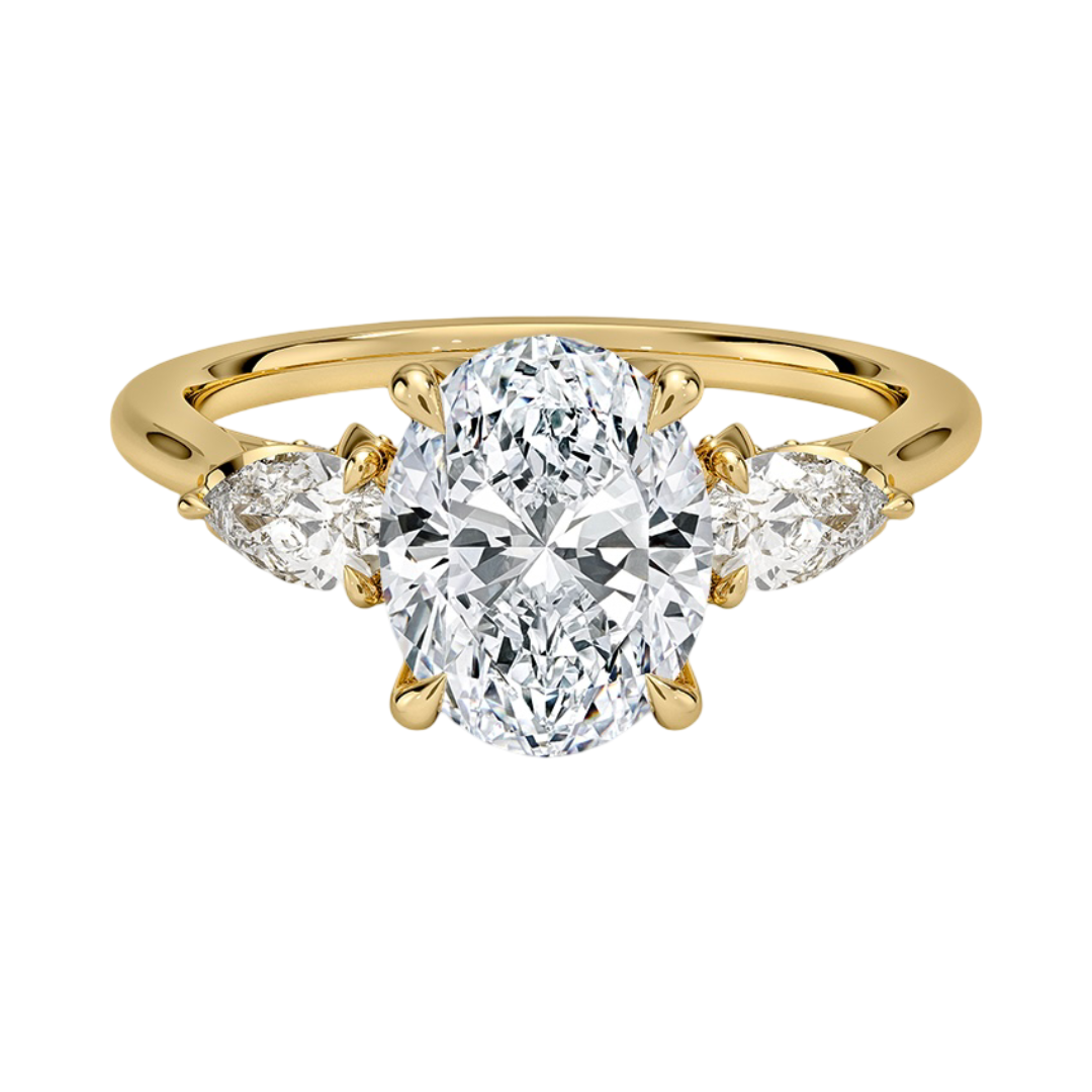 This timelessly elegant engagement ring showcases a breathtaking Oval Cut lab-grown diamond at its center, accentuated by two pear-shaped side diamonds that beautifully enhance its brilliance. A delicately crafted hidden halo wraps gracefully around the base of the center stone, adding a subtle sparkle that catches the light from every angle. Expertly set in warm 18K yellow gold, this ring exudes refined sophistication and enduring romance.