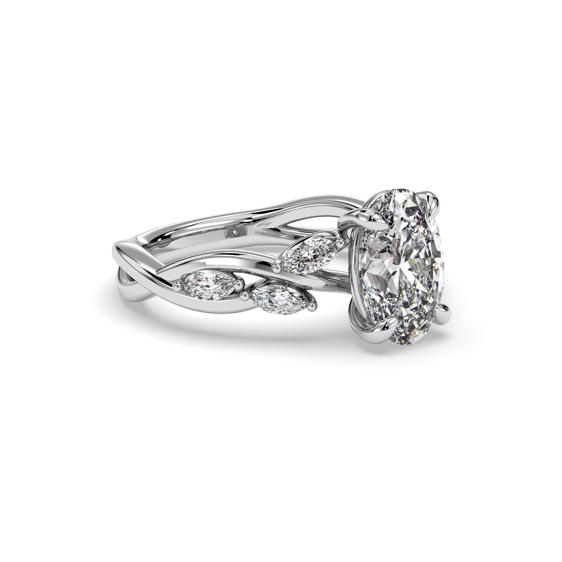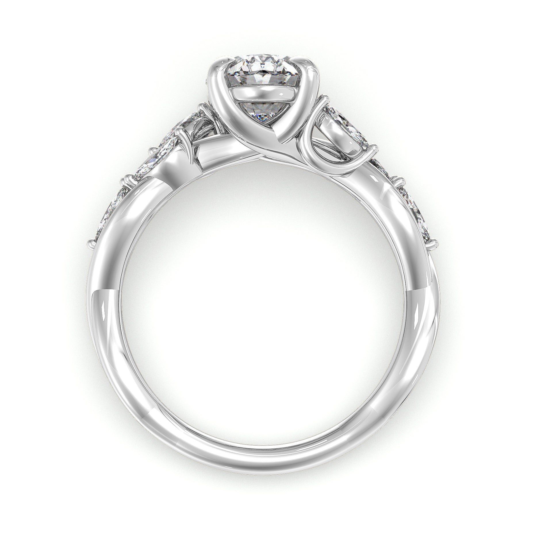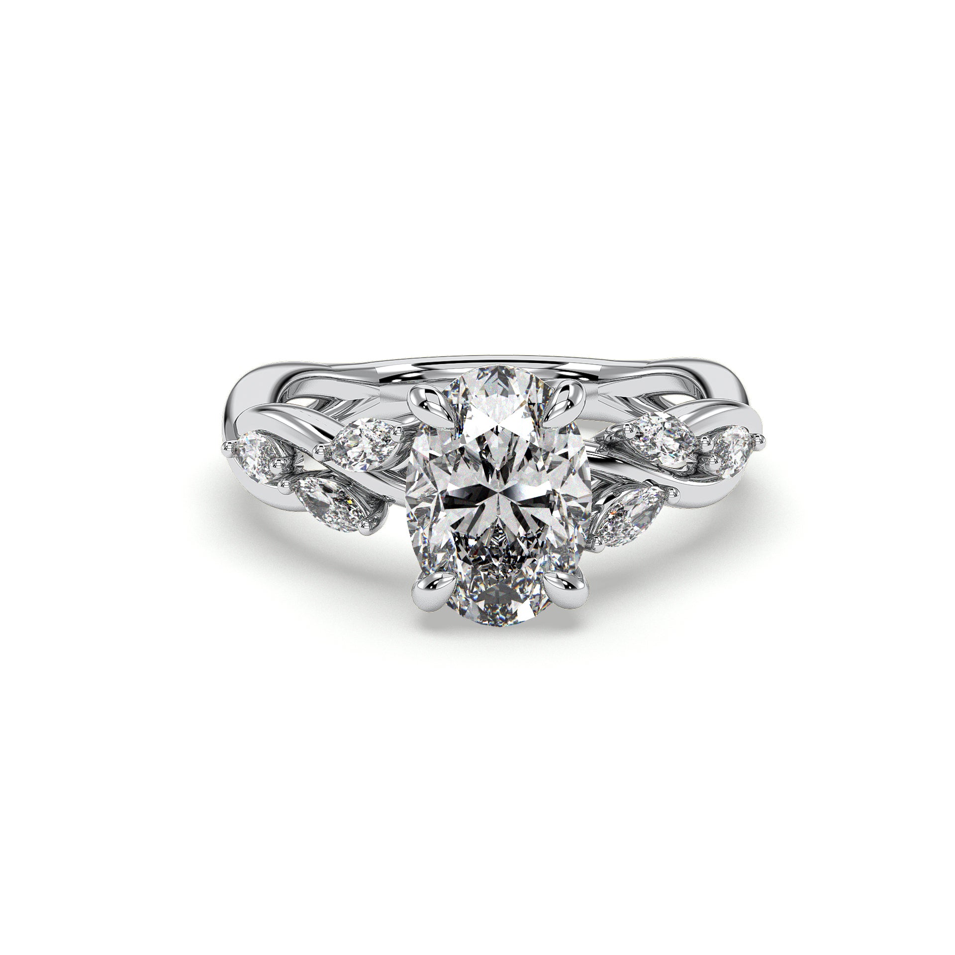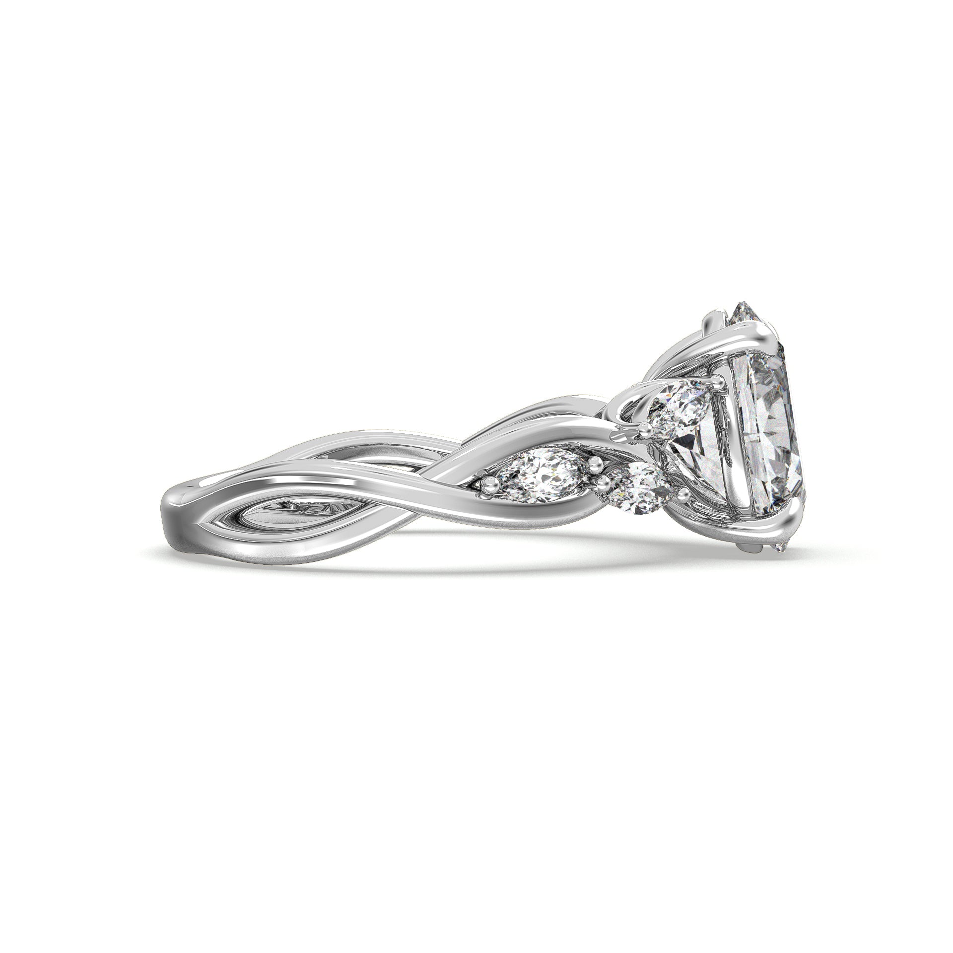 Capture your romance with this stunning engagement ring featuring a center diamond complemented by petal-inspired accent diamonds. The twisting design is features a marquise cut diamonds adding sparkle along one arm of the twist shank.