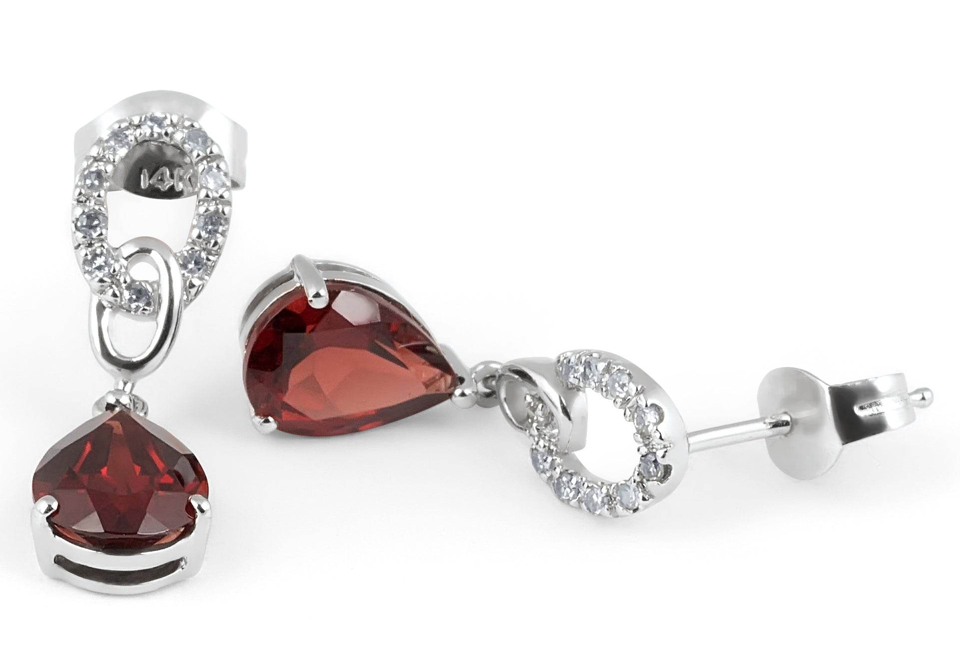 Striking in burgundy colour, these deep red drop garnet and diamond earrings are set in 14k white gold and feature pear shape garnet complemented by round brilliant diamonds.