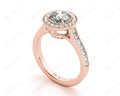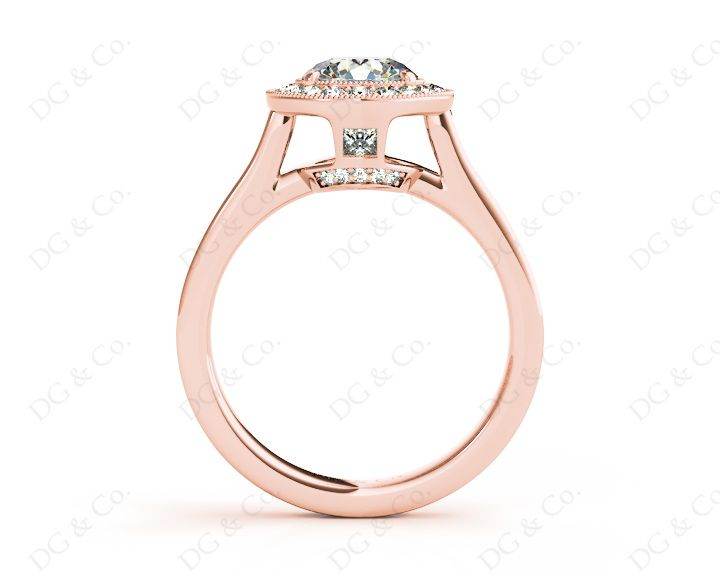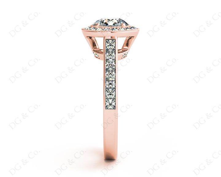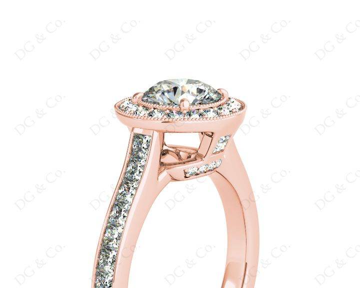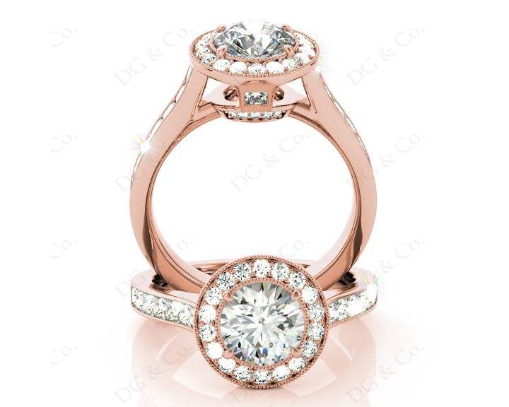 Halo Setting Engagement Ring with a Round Cut Diamond in a Four Claws Setting with Eighteen Small Round Cut Diamonds Grain set around the Centre Stone and Sixteen Princes Cut Channel Setting on the Shoulders.