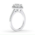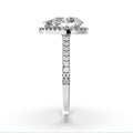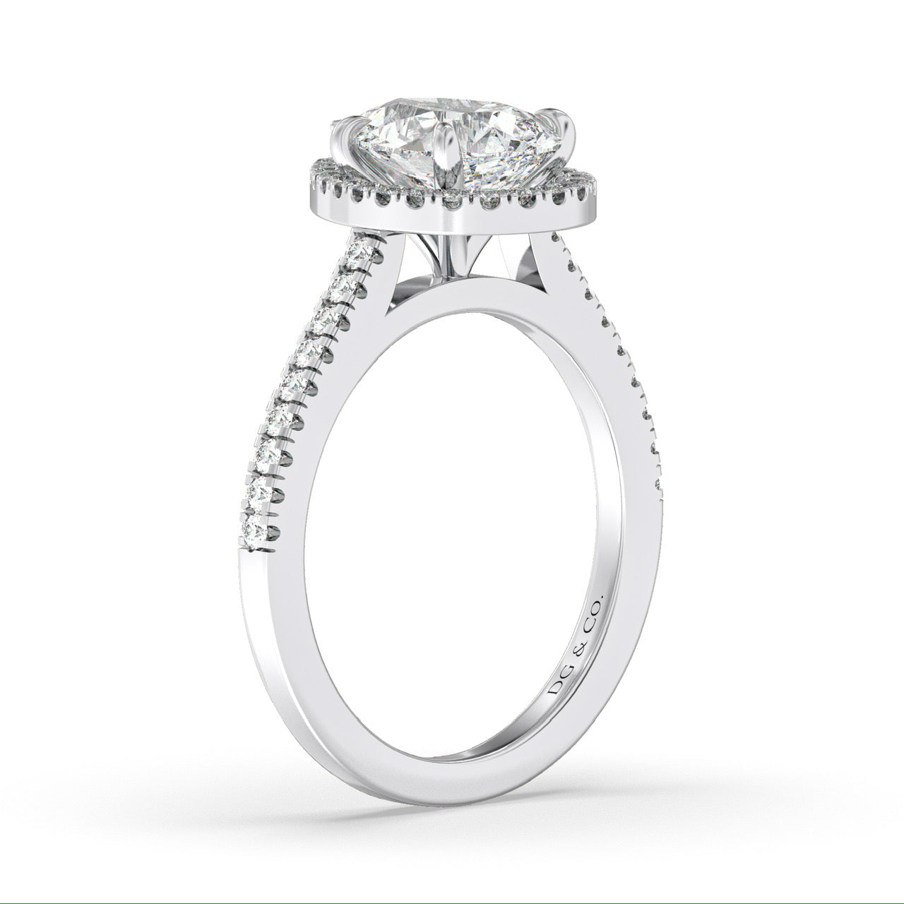 The ring who brings grace and sophistication into every room they enter: a diamond pave band crowned with a halo round diamonds surrounding the pear cut center stone creating a delicate harmony of elegance and imagination.