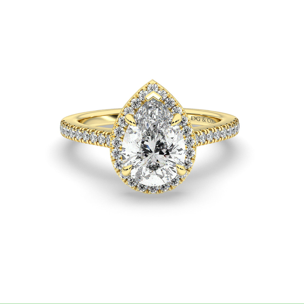 The ring who brings grace and sophistication into every room they enter: a diamond pave band crowned with a halo round diamonds surrounding the pear cut center stone creating a delicate harmony of elegance and imagination.
