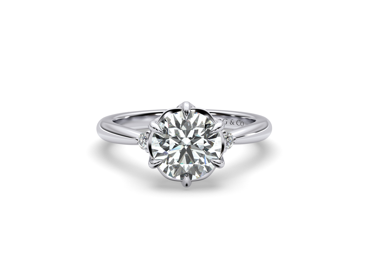 A stunning symbol of love, this engagement ring features beautiful round cut diamonds framing the center stone