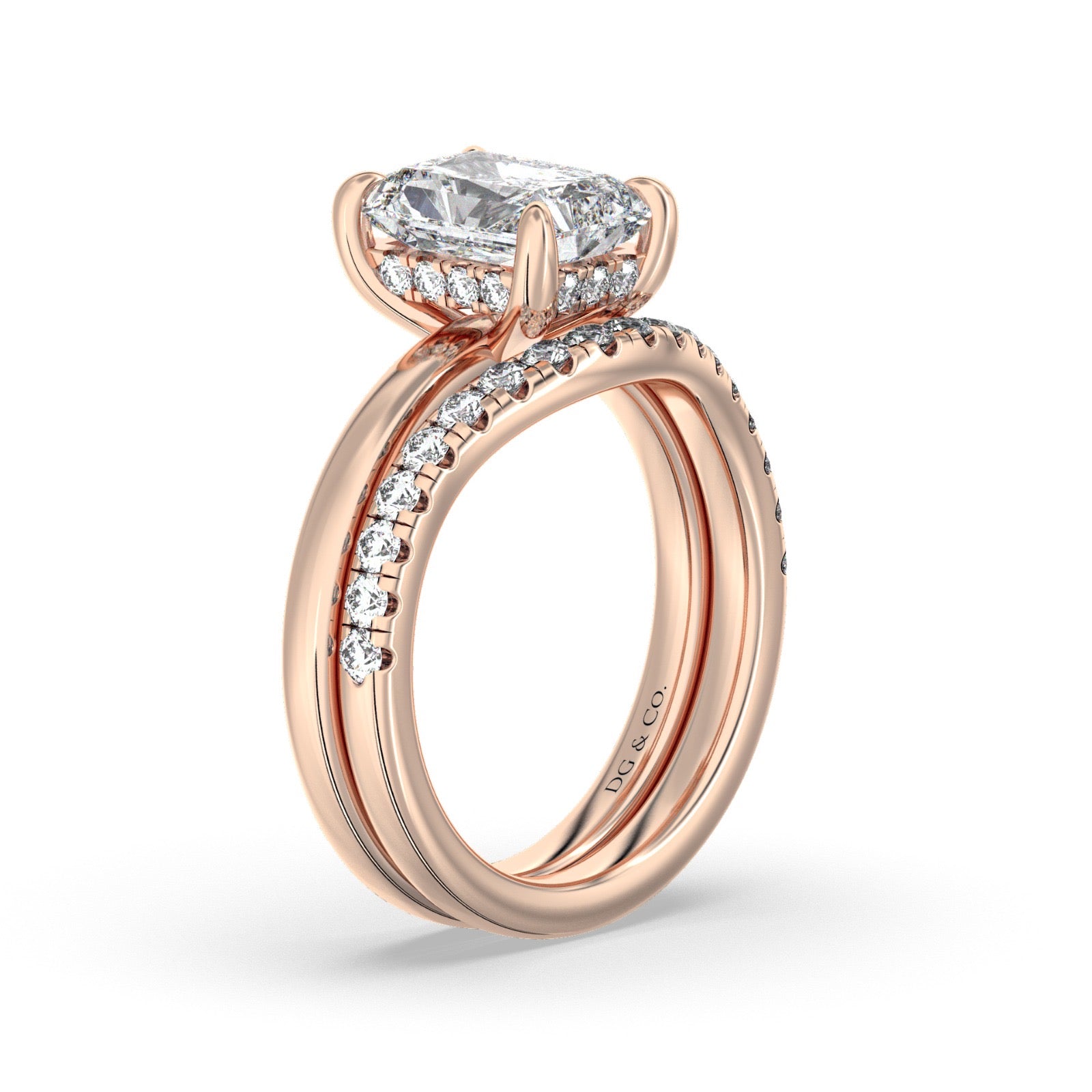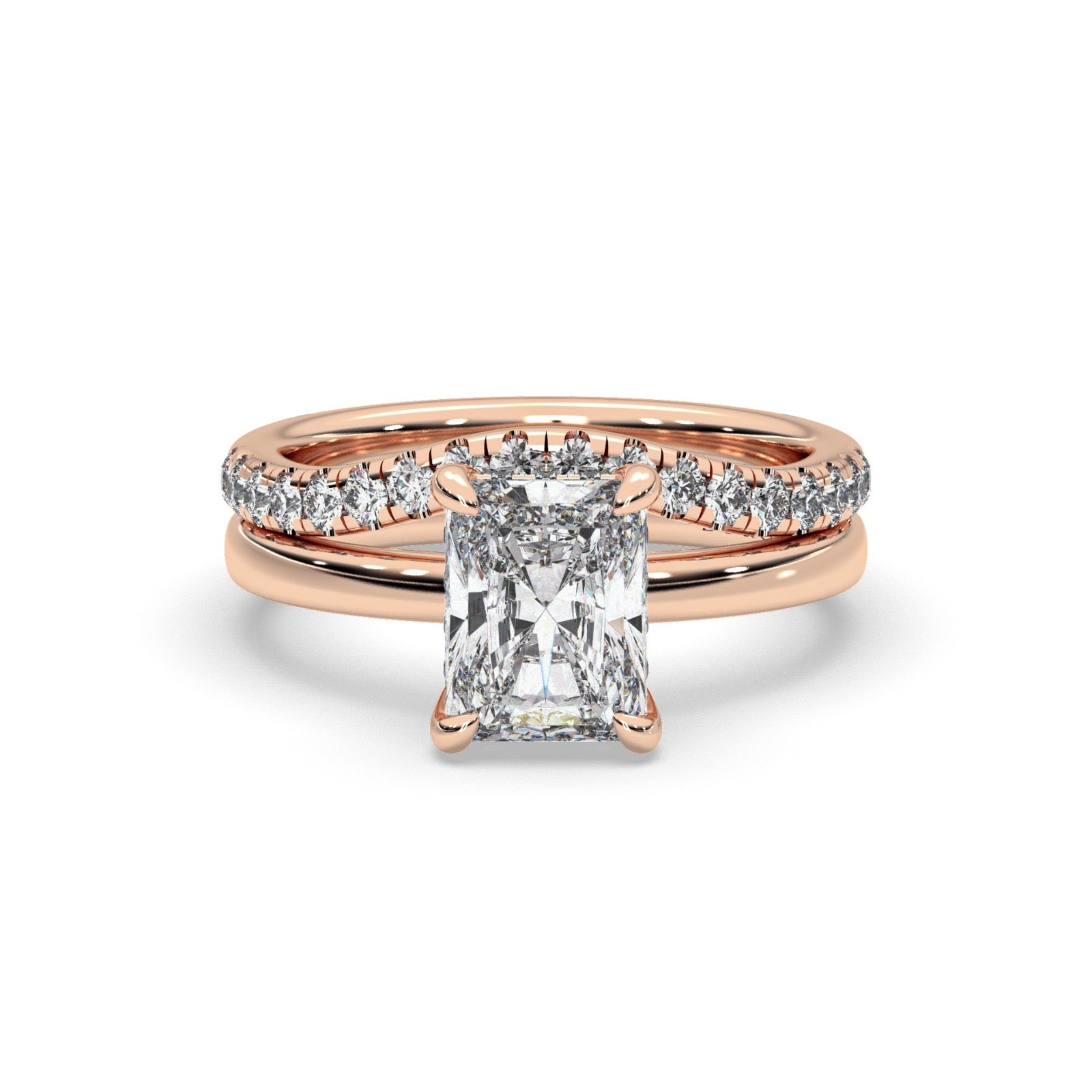 Thanks to its striking simplicity, this radiant solitaire engagement wedding set rings are perhaps our most popular style. This ring, crafted with a matching wedding band to complete the set.
