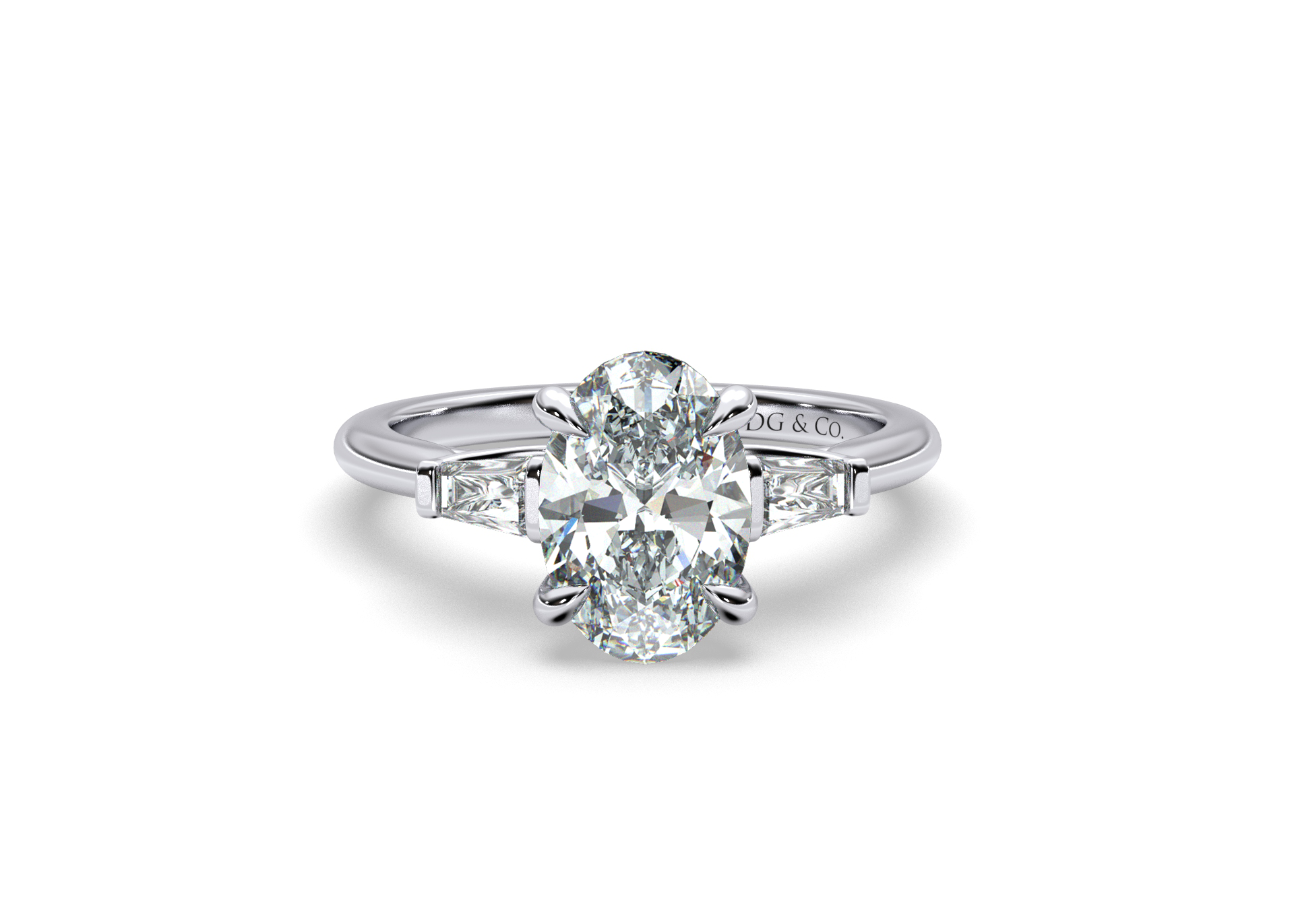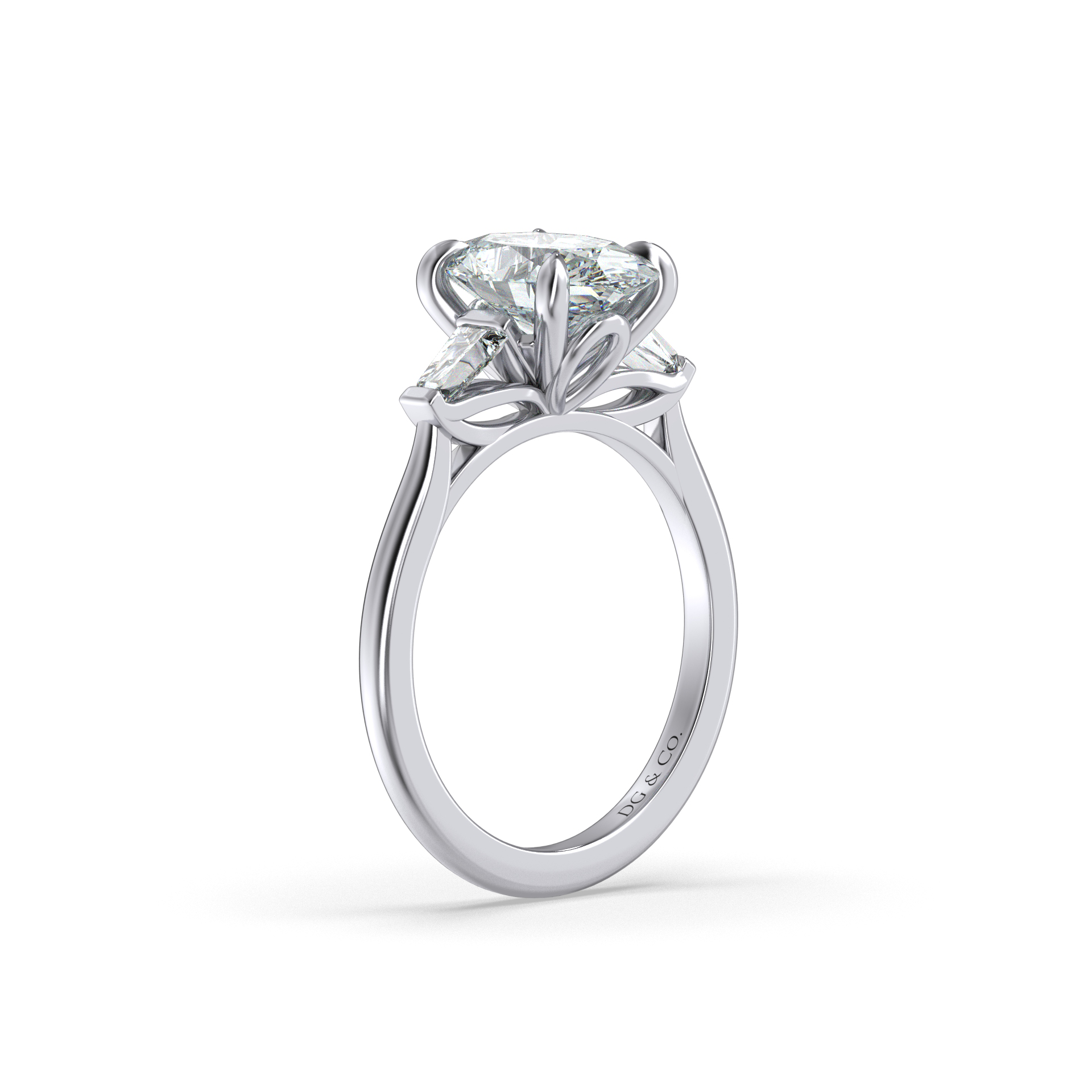 Romantic 3 stone oval cut diamond engagement ring settings represent the past, present and future of your love. Two pear shaped side stones grace the style for a modern look.