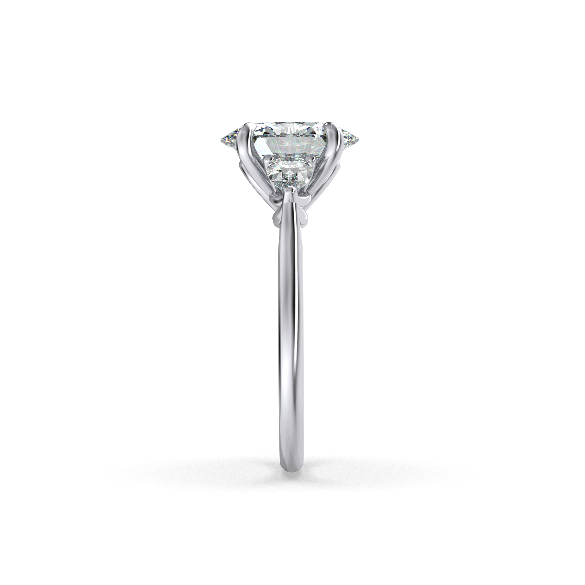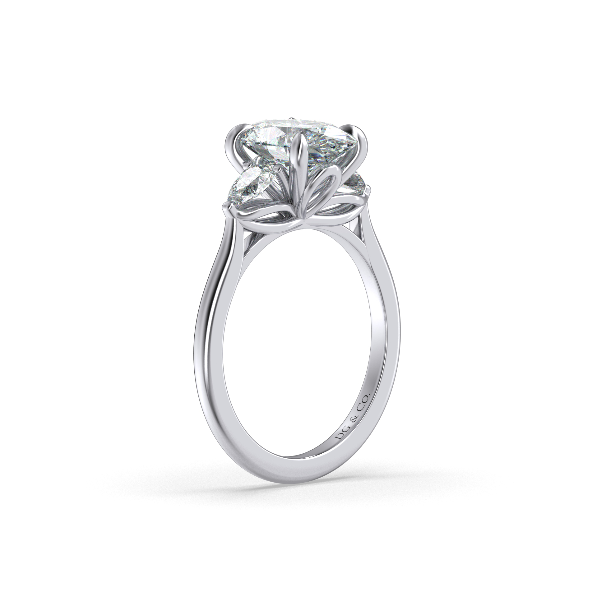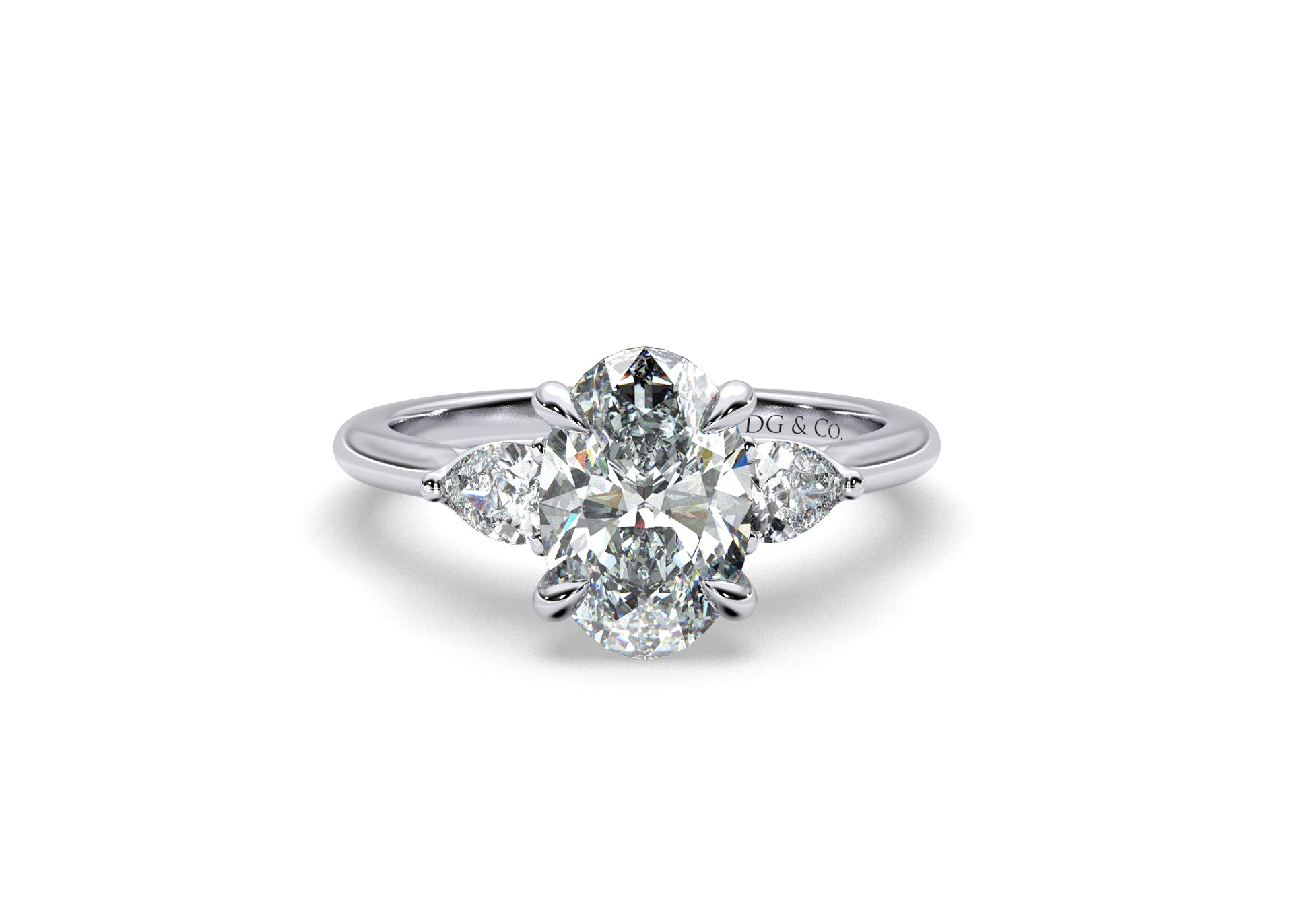 Romantic Oval Cut 3 stone engagement ring settings represent the past, present and future of your love. Two pear shaped side stones grace this style modern and stylish.