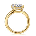 An intricately designed, hidden halo basket creates a most stunning display astride a curved modern-design shank. Breathtaking and daring with a whimsical approach to modern design.