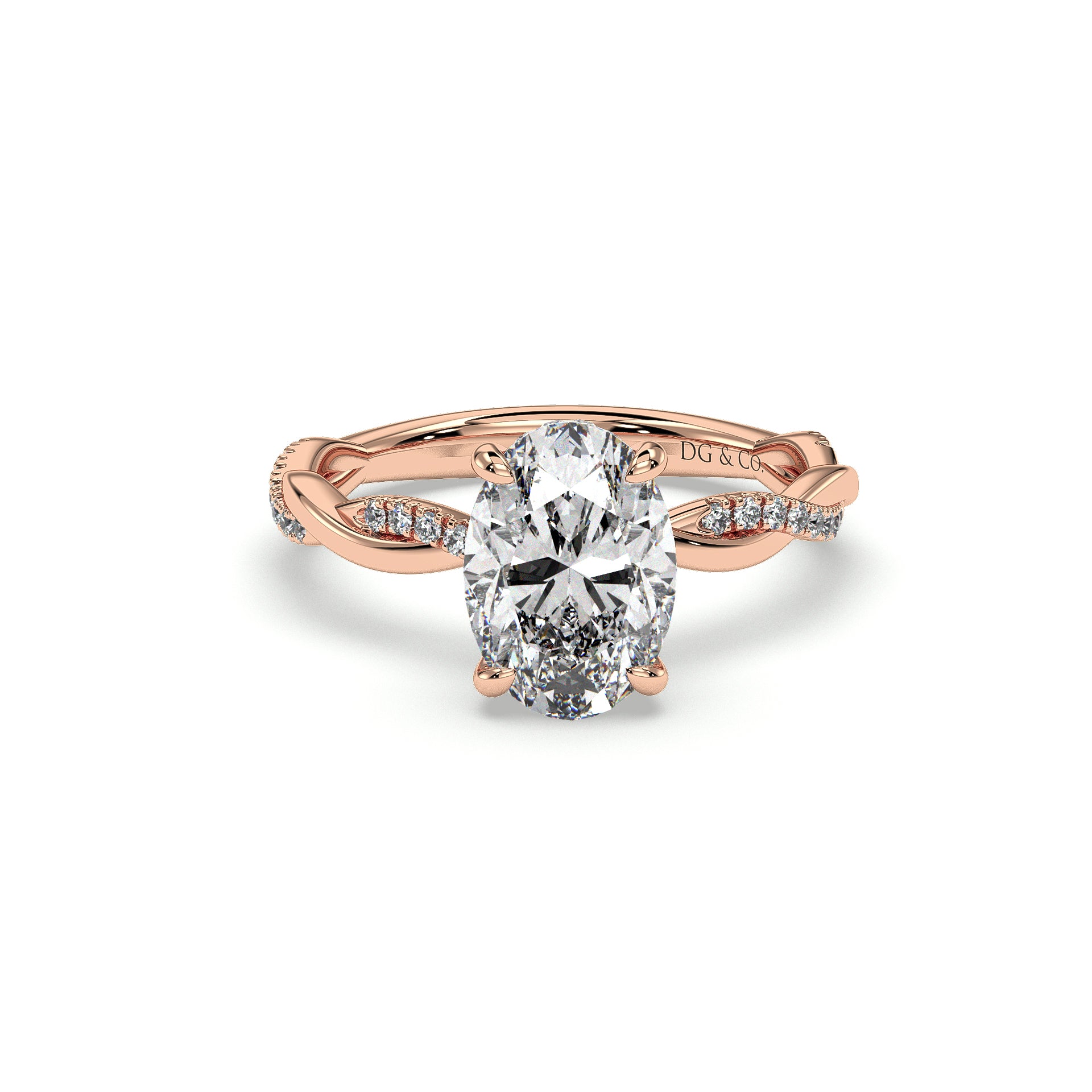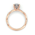 The gracefully entwining twist design of this gorgeous hidden halo engagement ring. The center diamond is completed by petal-like accent diamonds at the sides, and a trail of pavé-set diamonds accents one arm of the twisting split shank.