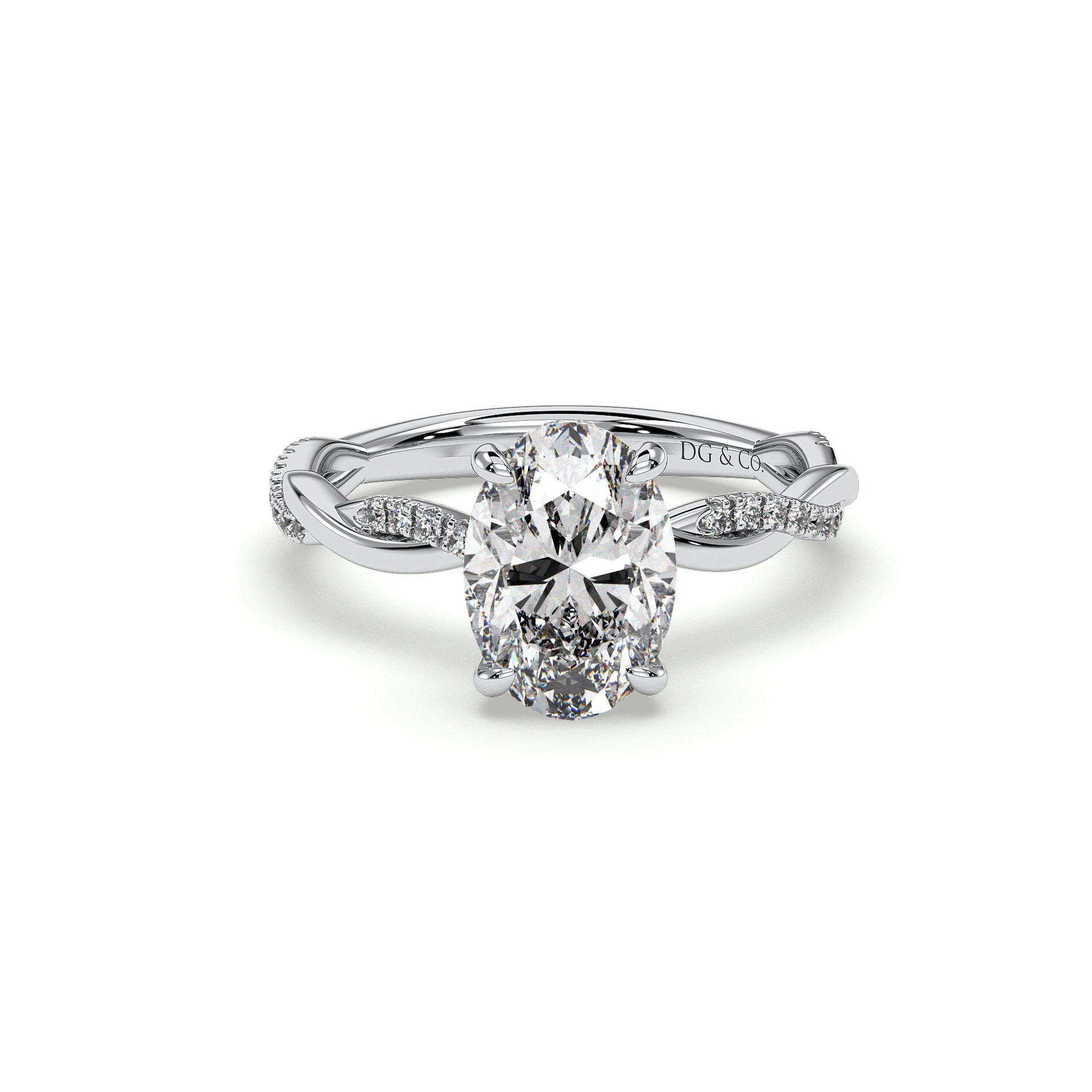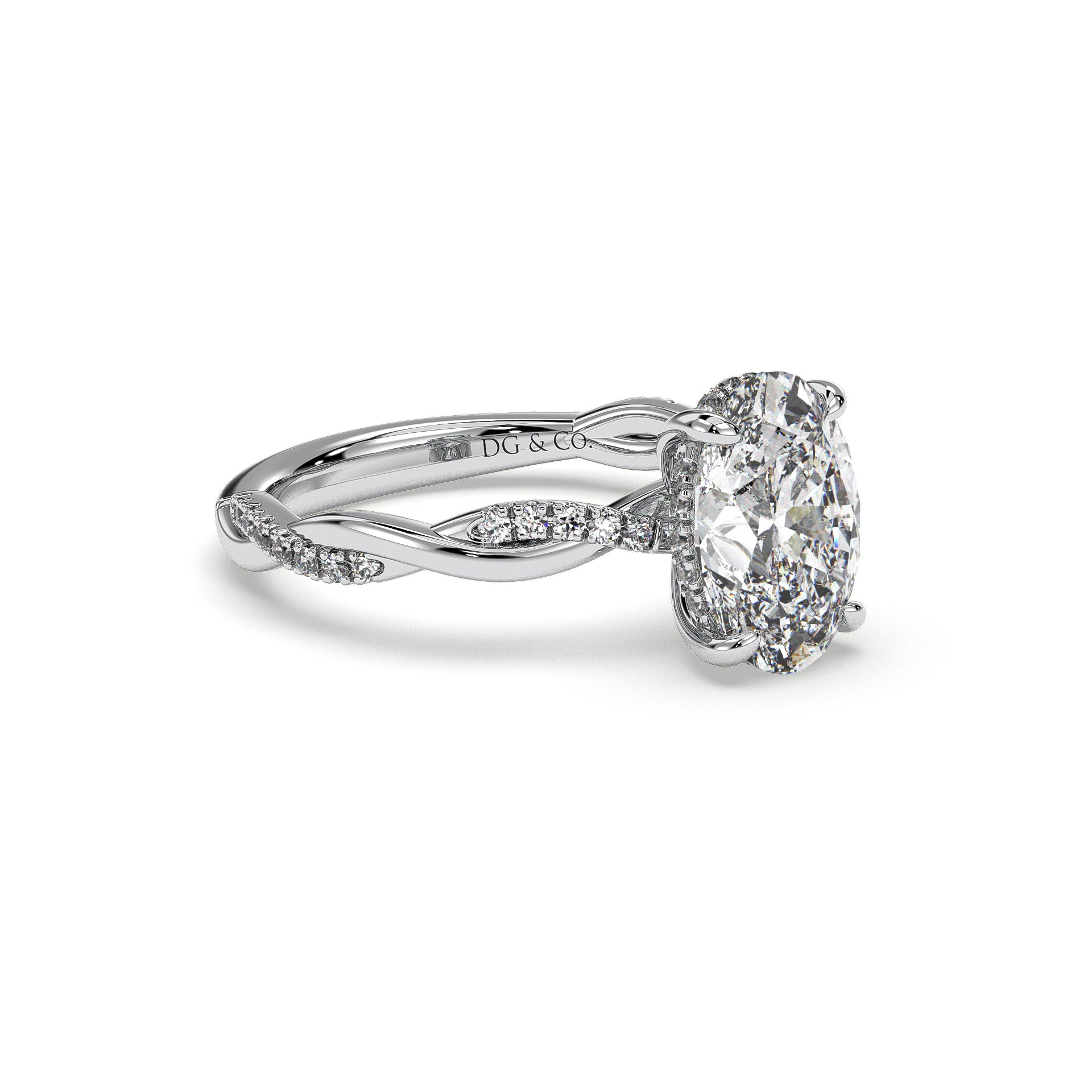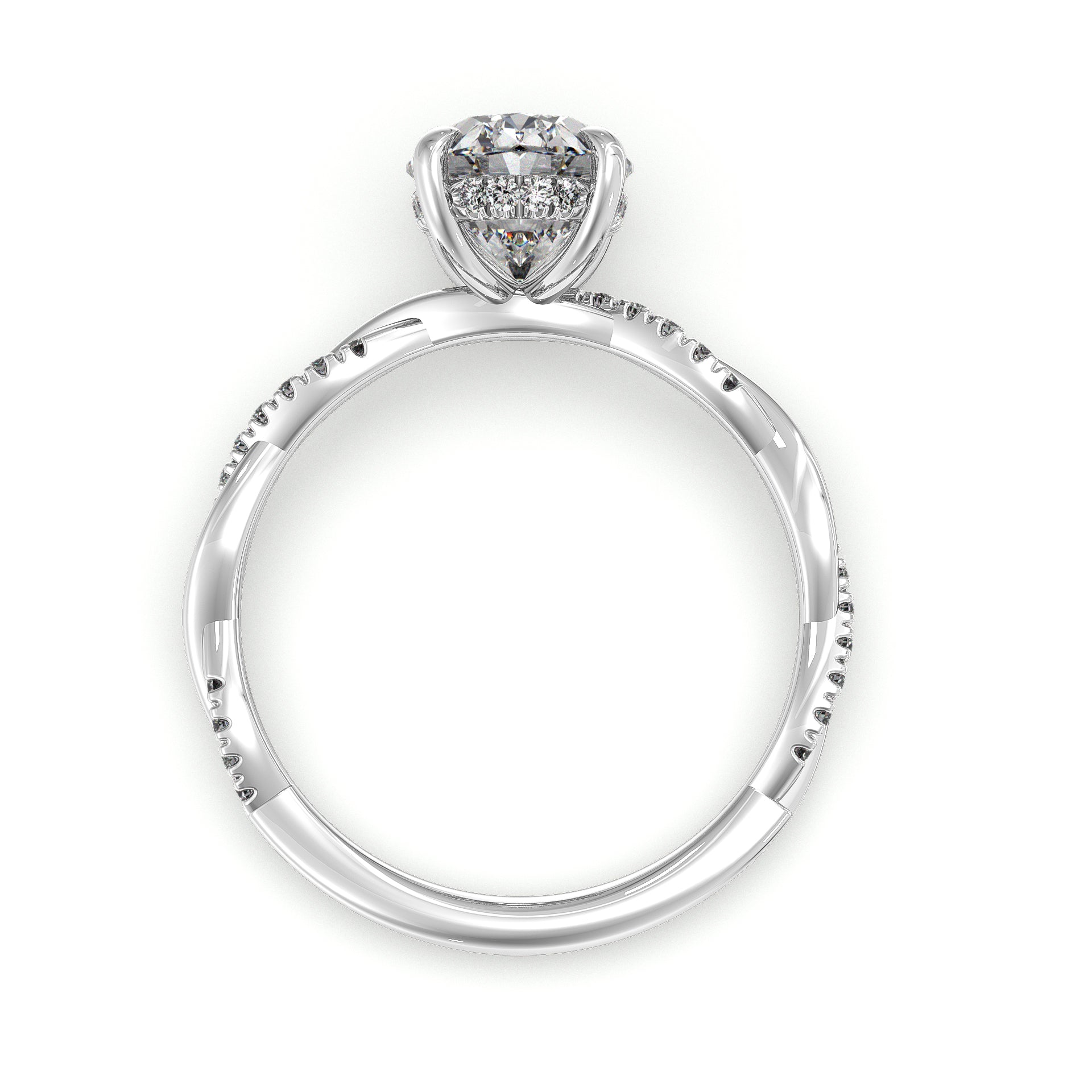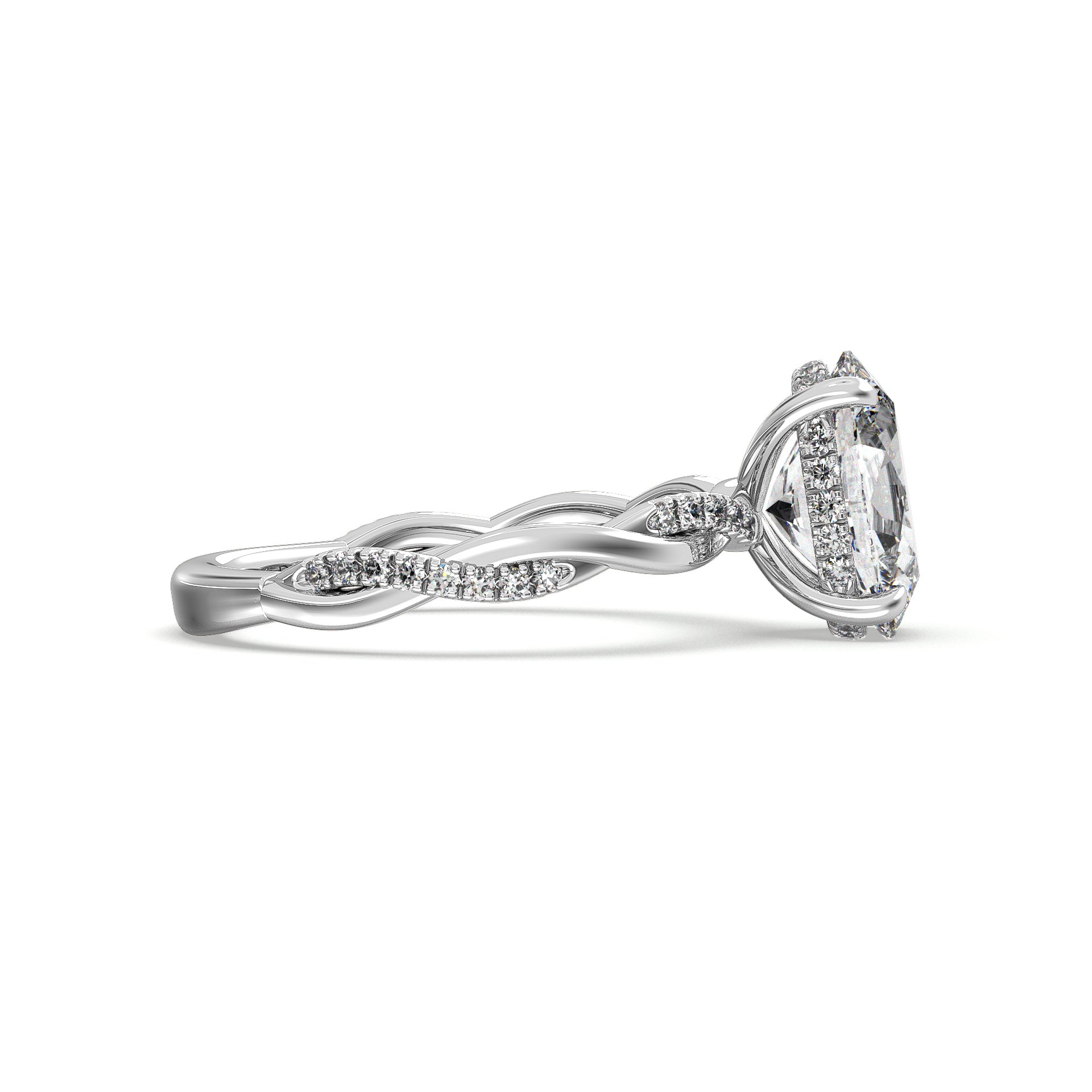 The gracefully entwining twist design of this gorgeous hidden halo engagement ring. The center diamond is completed by petal-like accent diamonds at the sides, and a trail of pavé-set diamonds accents one arm of the twisting split shank.