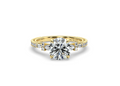 Ideal for any center diamond of your choice, this three stone diamond engagement ring showcases a diamond accent along the shank and milgrain detailing.