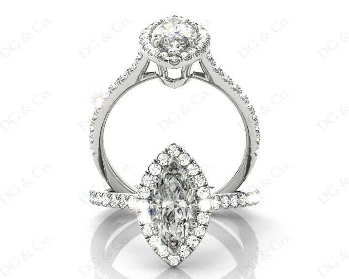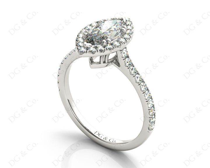 Halo Diamond Engagement Ring with Marquise Cut Diamond in Four Claws Setting with Thirty-six round Brilliant Micro Pave Setting around the Centre Stone and Down the Shoulders.