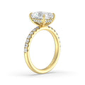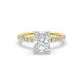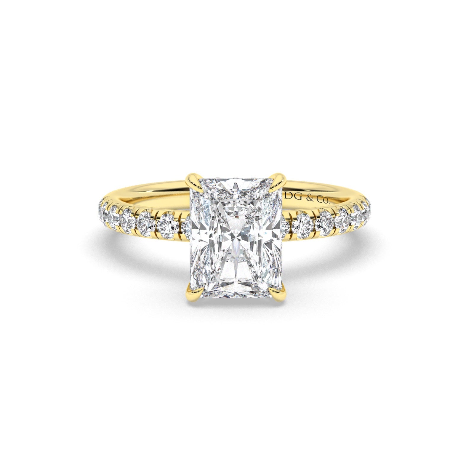 Beautifully crafted, this hidden halo radiant cut diamond engagement ring features french pavé-set diamonds sparkling along the shank.