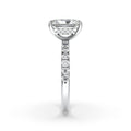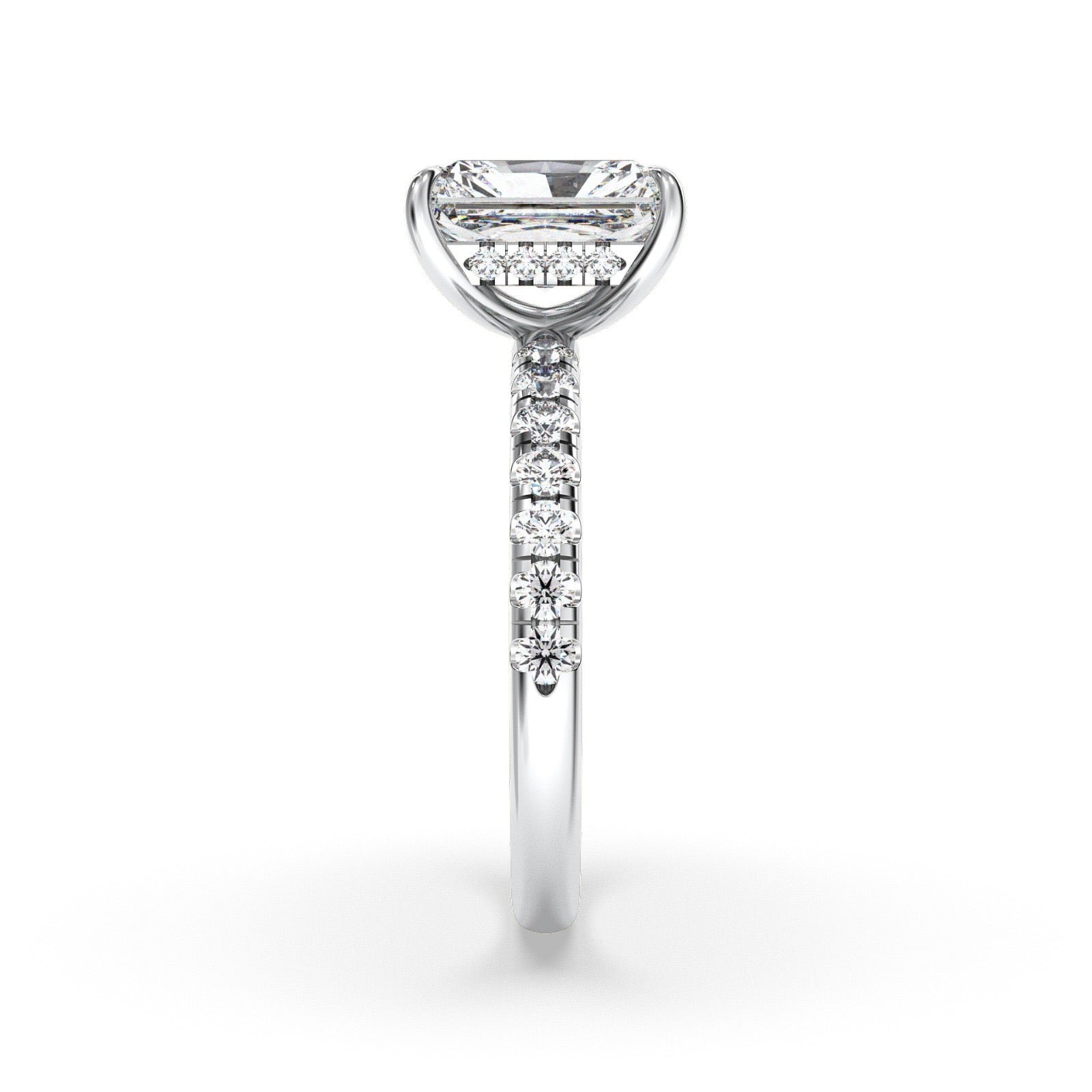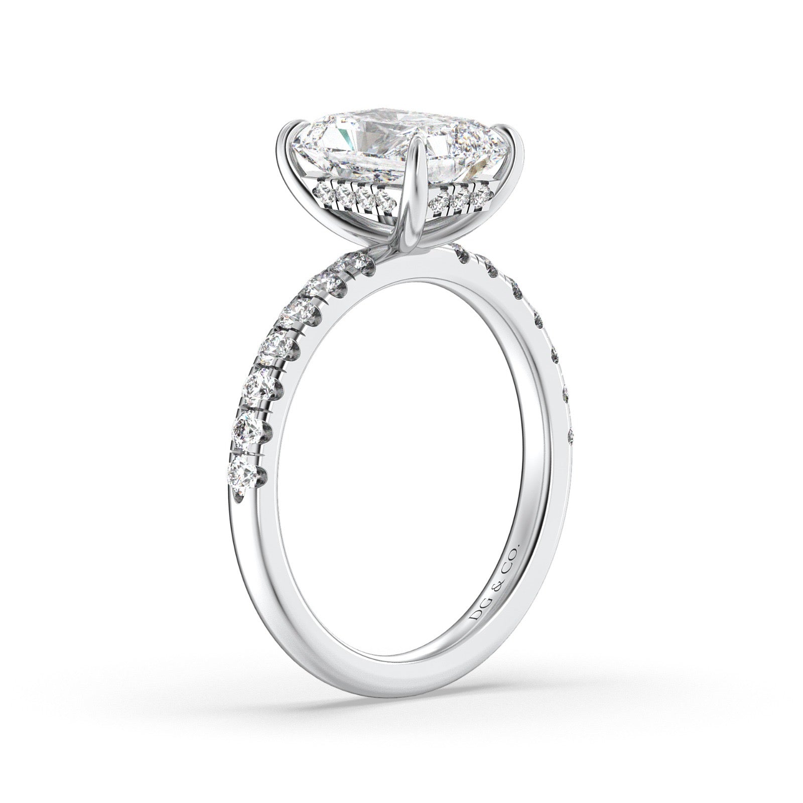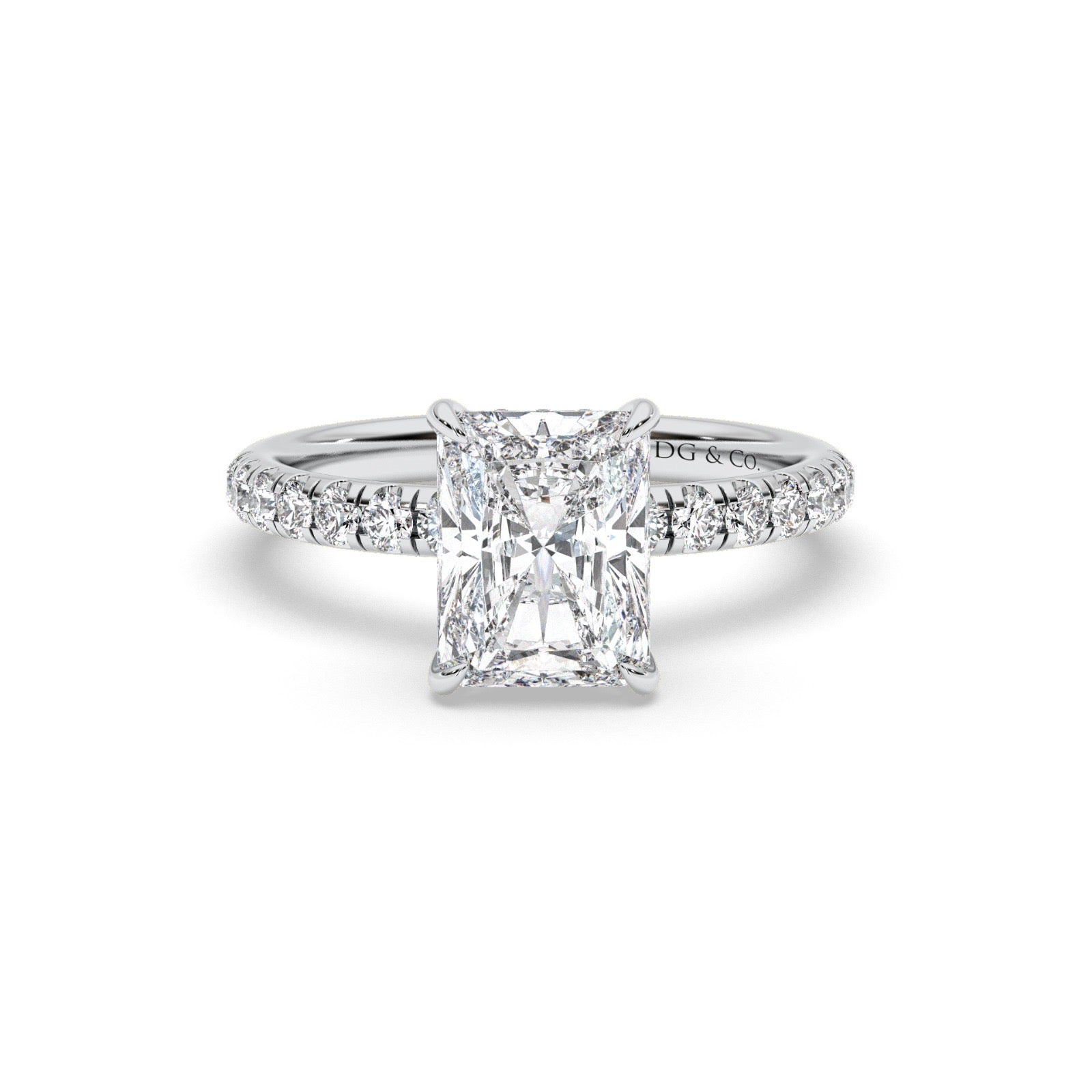 Beautifully crafted, this hidden halo radiant cut diamond engagement ring features french pavé-set diamonds sparkling along the shank.