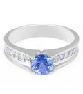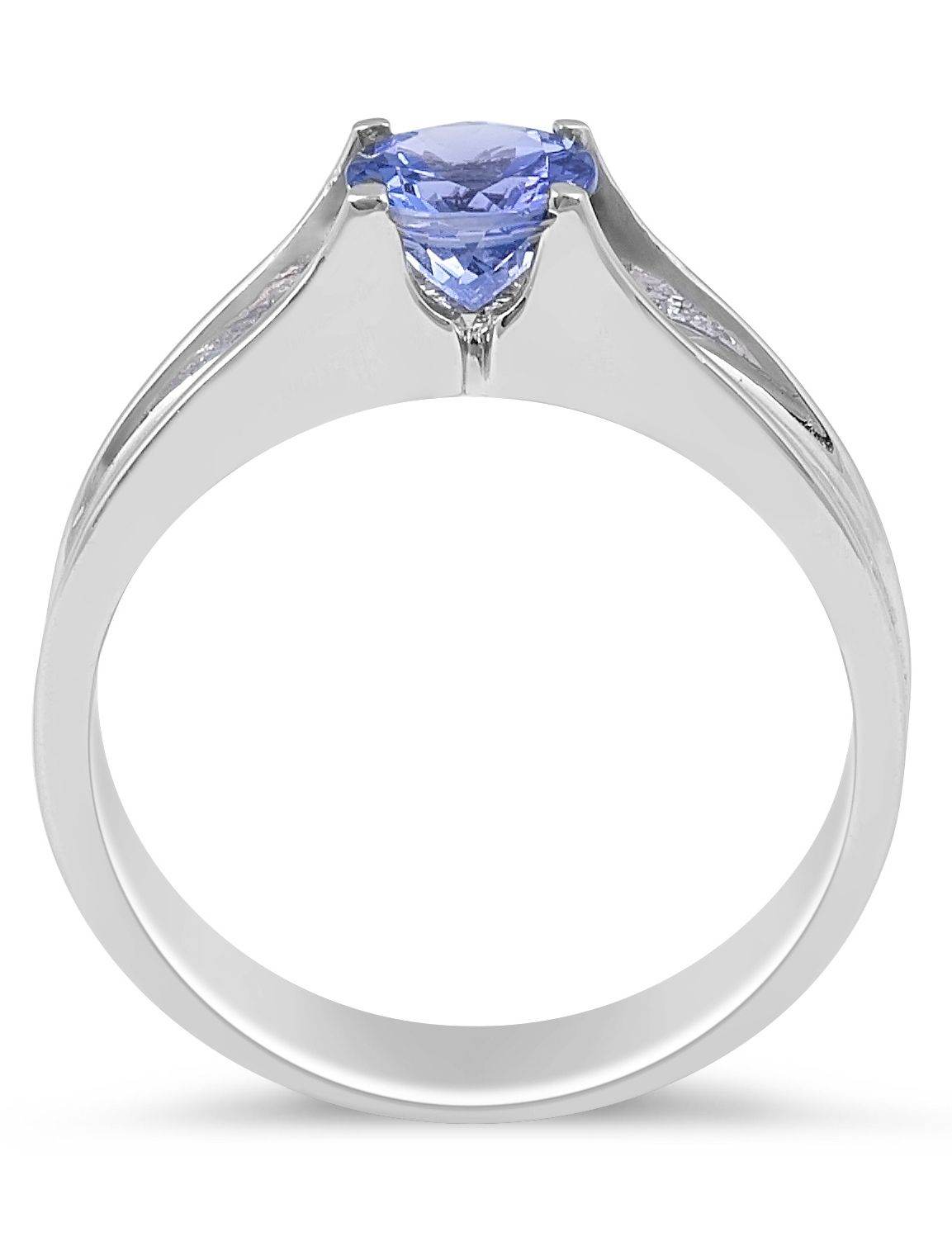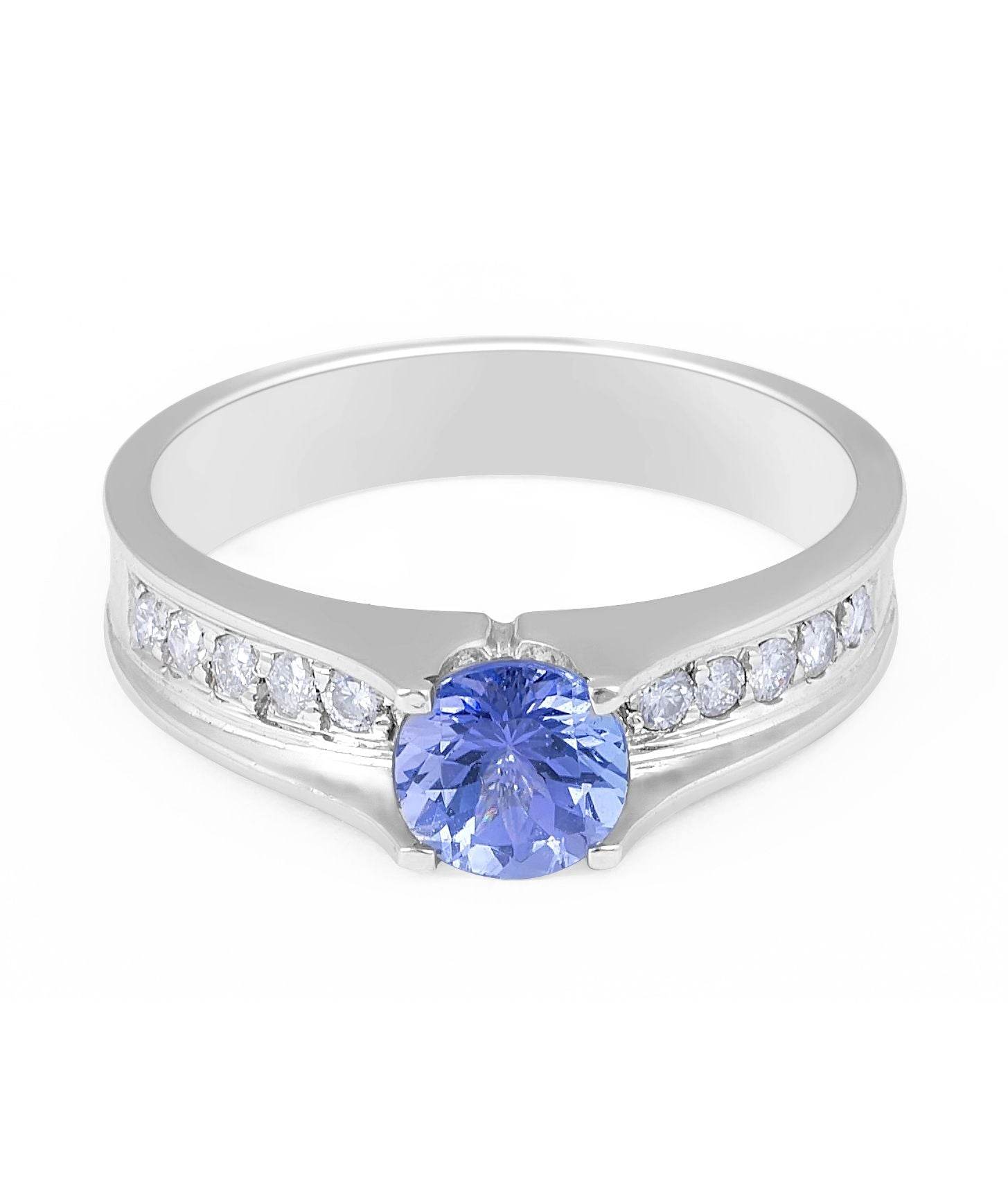 A unique 18 Karat white gold ring featuring a 0.85 carat round tanzanite as a centre stone. Beautiful diamonds are set on the band in a gorgeous tunnel of sparkle formed by the setting of the tanzanite. This ring is one of the kind.