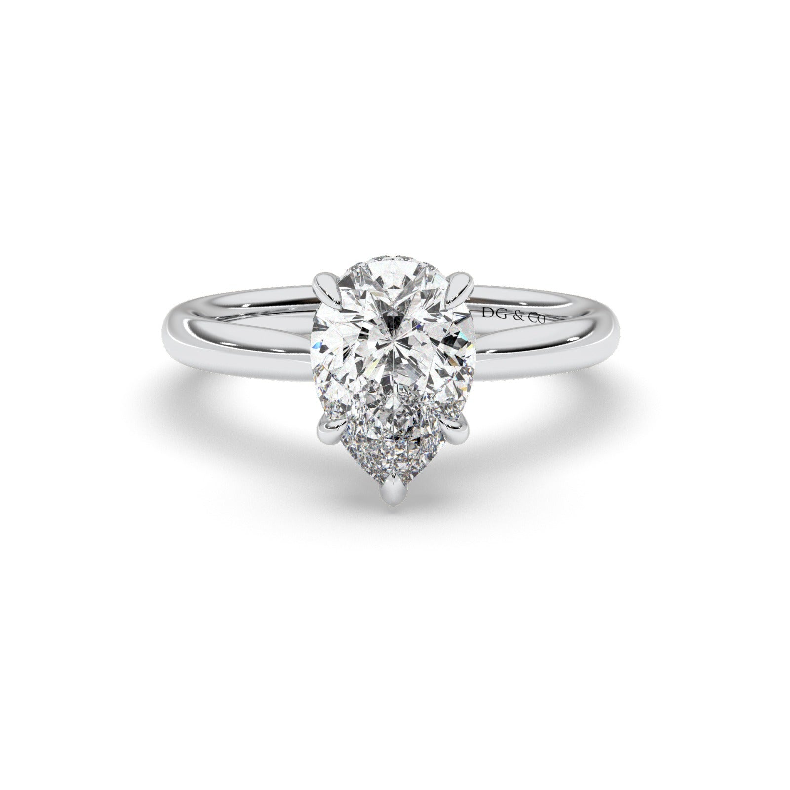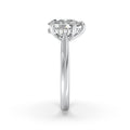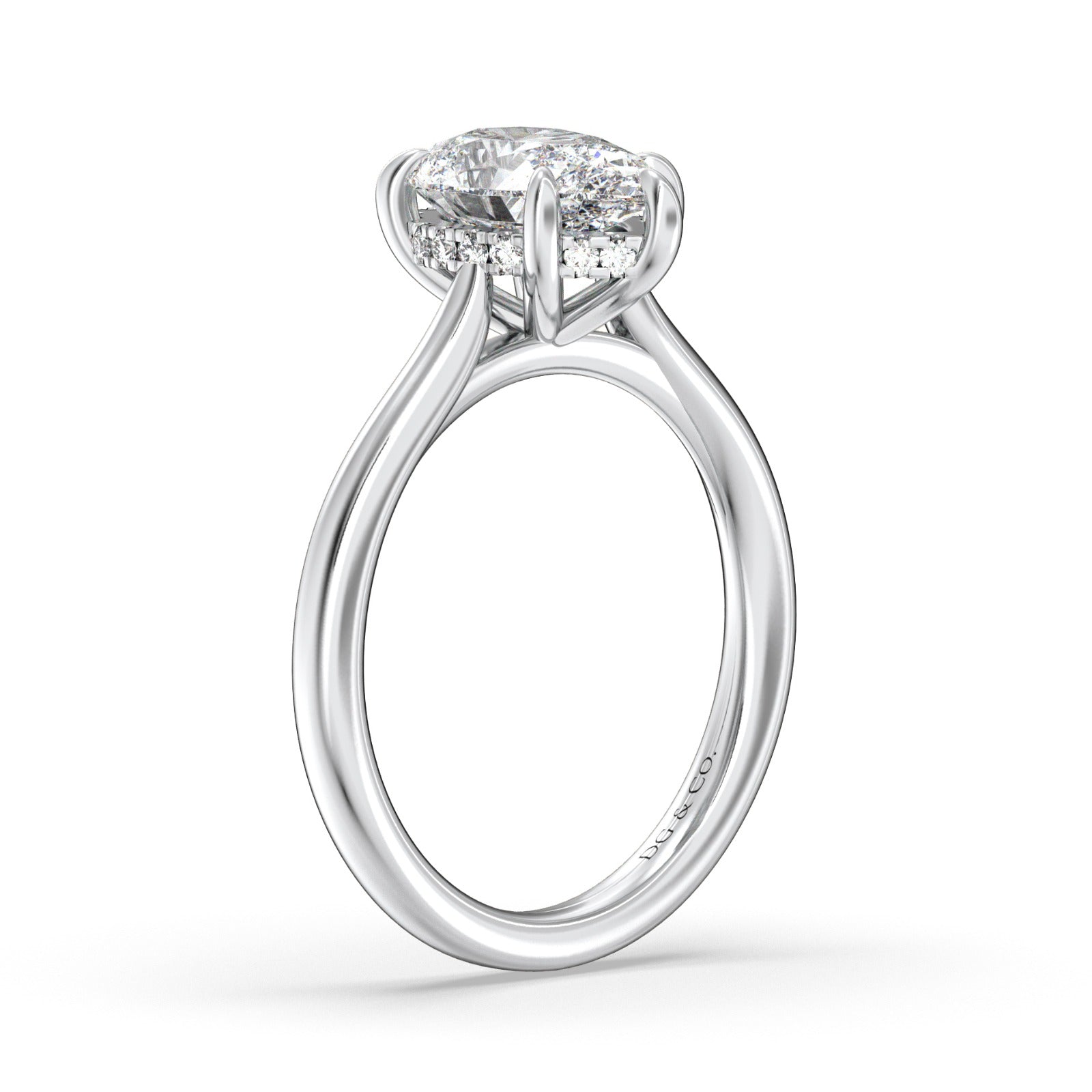 Classic from a bird's-eye view, this solitaire has a delicate hiden halo diamond profile and slight cathedral that put your center stone on display.