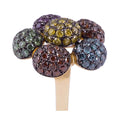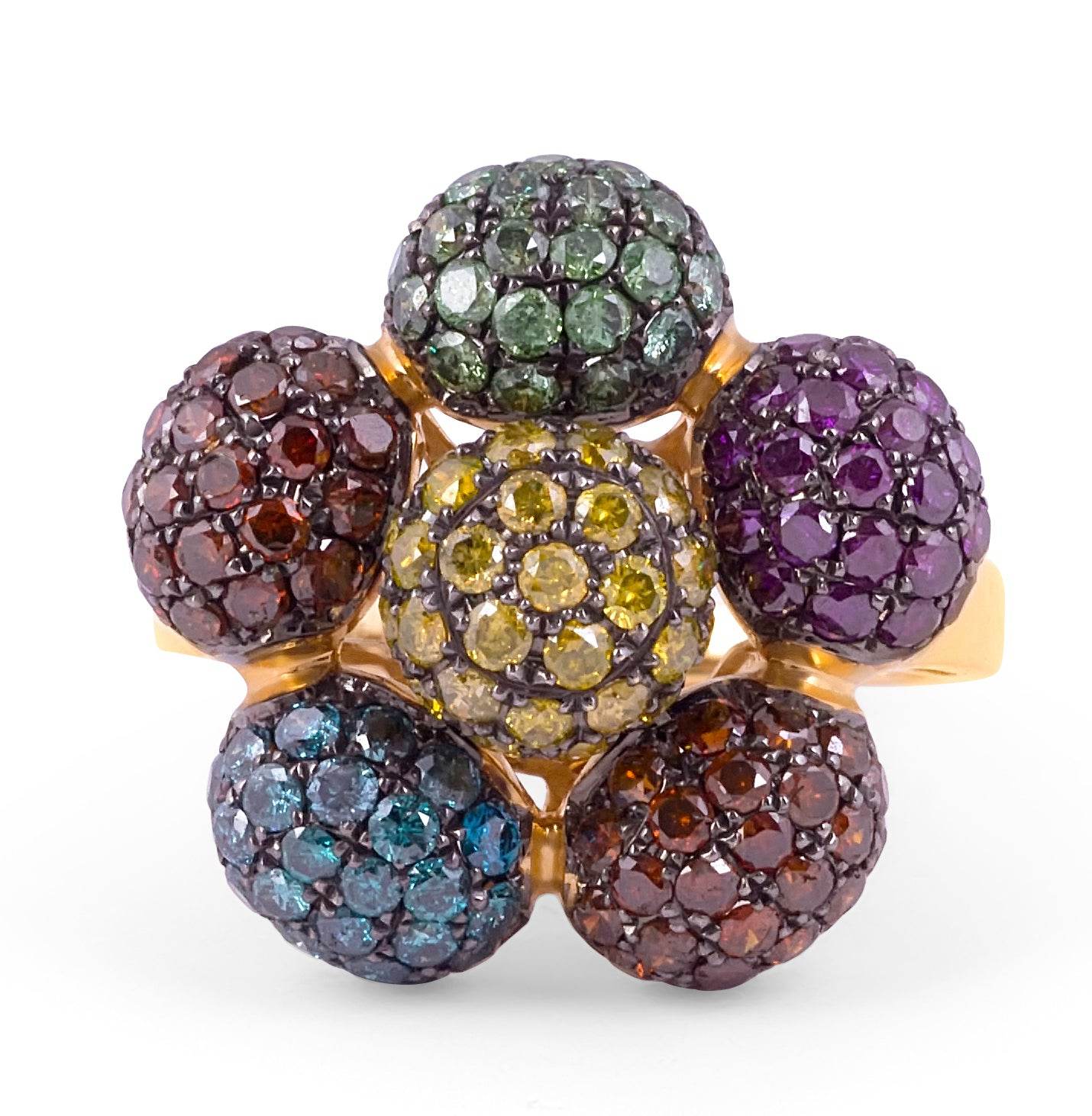 A striking piece. This uniquely designed cocktail ring beautifully framed in 14 Karat yellow gold is micro pave set with a combination of 48 red diamonds (0.85 Carat), 25 blue diamonds (0.48 Carat) , 31 yellow diamonds (0.58 Carat) , 24 green diamonds (0.46 Carat) and 25 purple diamonds (0.47 Carat).