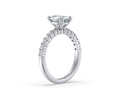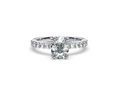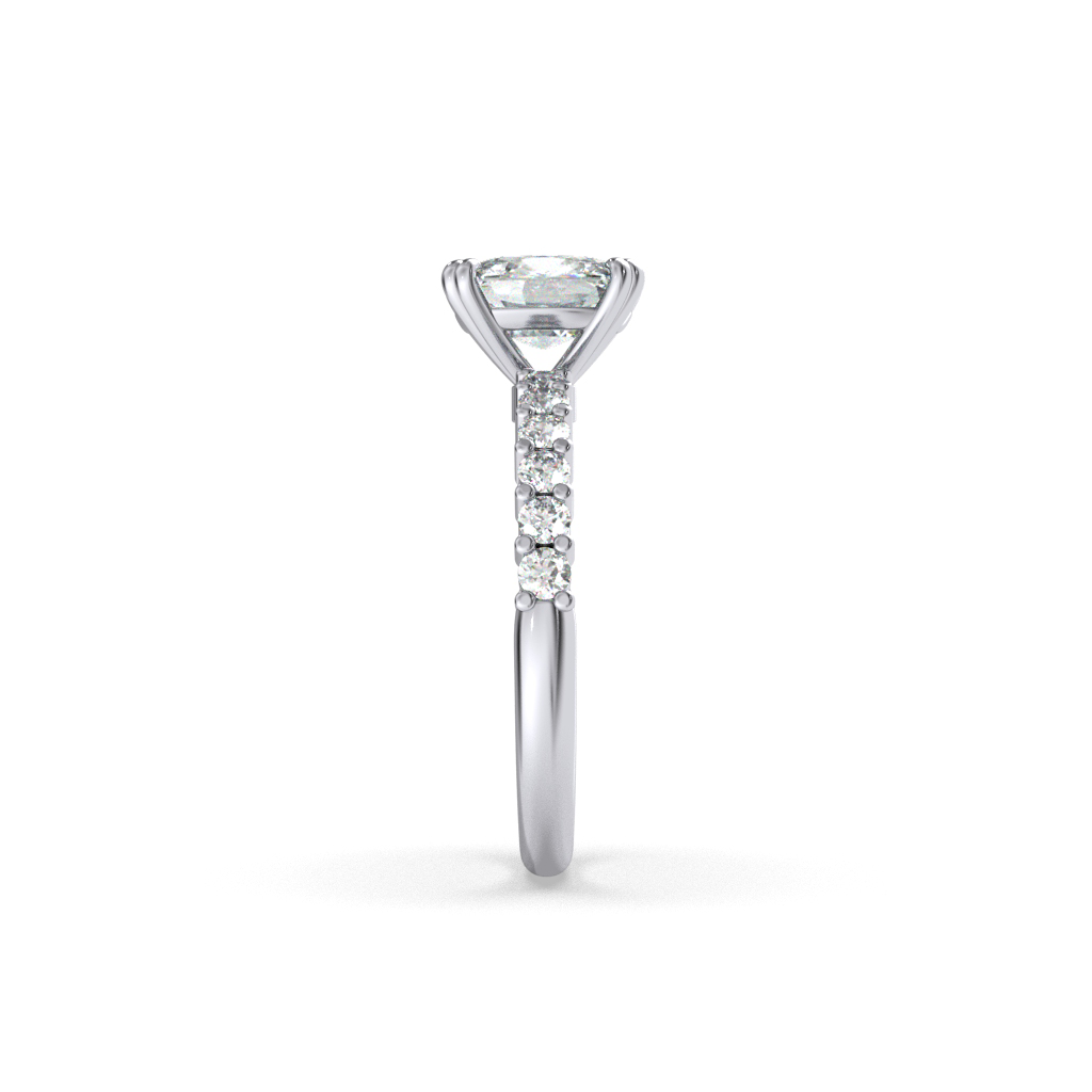 This dainty and romantic design features round cut diamonds as side stones in shared prong settings to showcase their true beauty and sparkle
