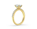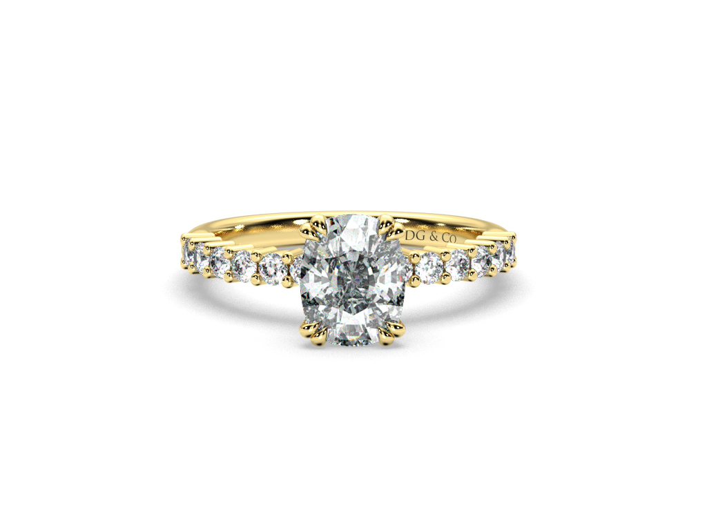 This dainty and romantic design features round cut diamonds as side stones in shared prong settings to showcase their true beauty and sparkle