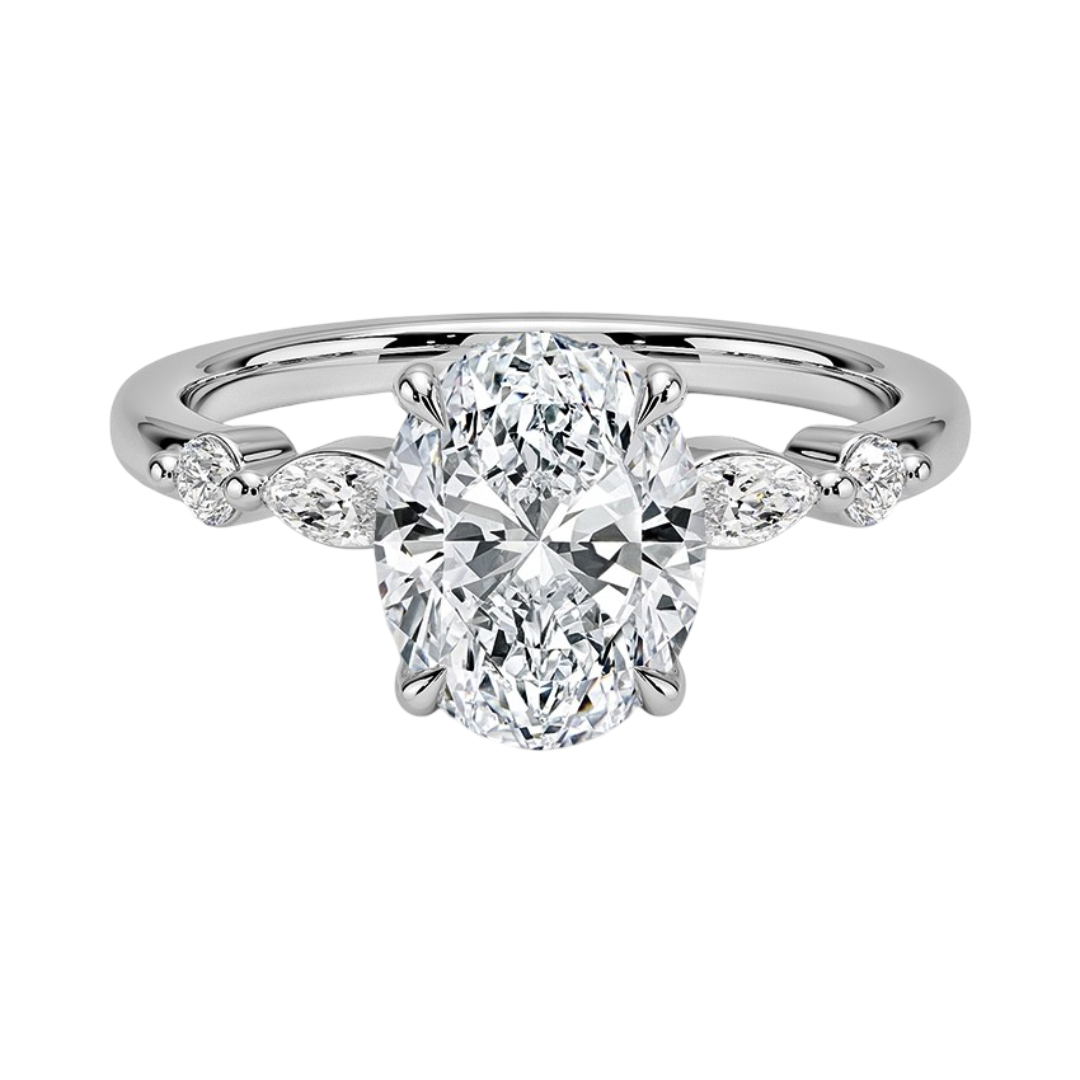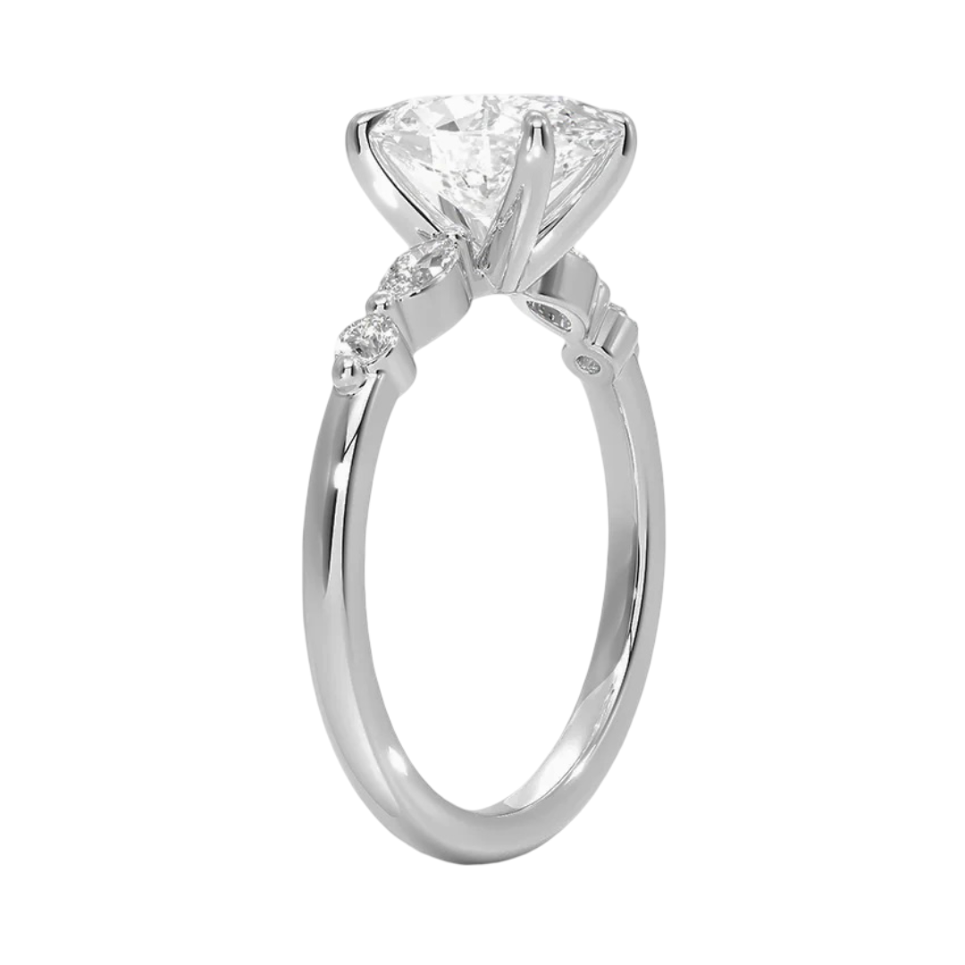 A stunning expression of love, this engagement ring features elegant marquise- and round-cut accent diamonds set in a shimmering array around the center stone. Crafted in luminous 18K white gold, this piece exudes timeless sophistication and radiant brilliance.