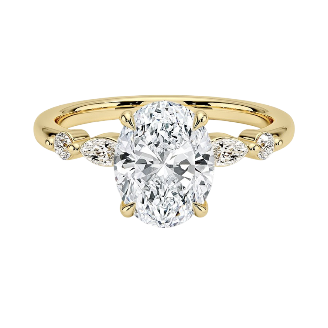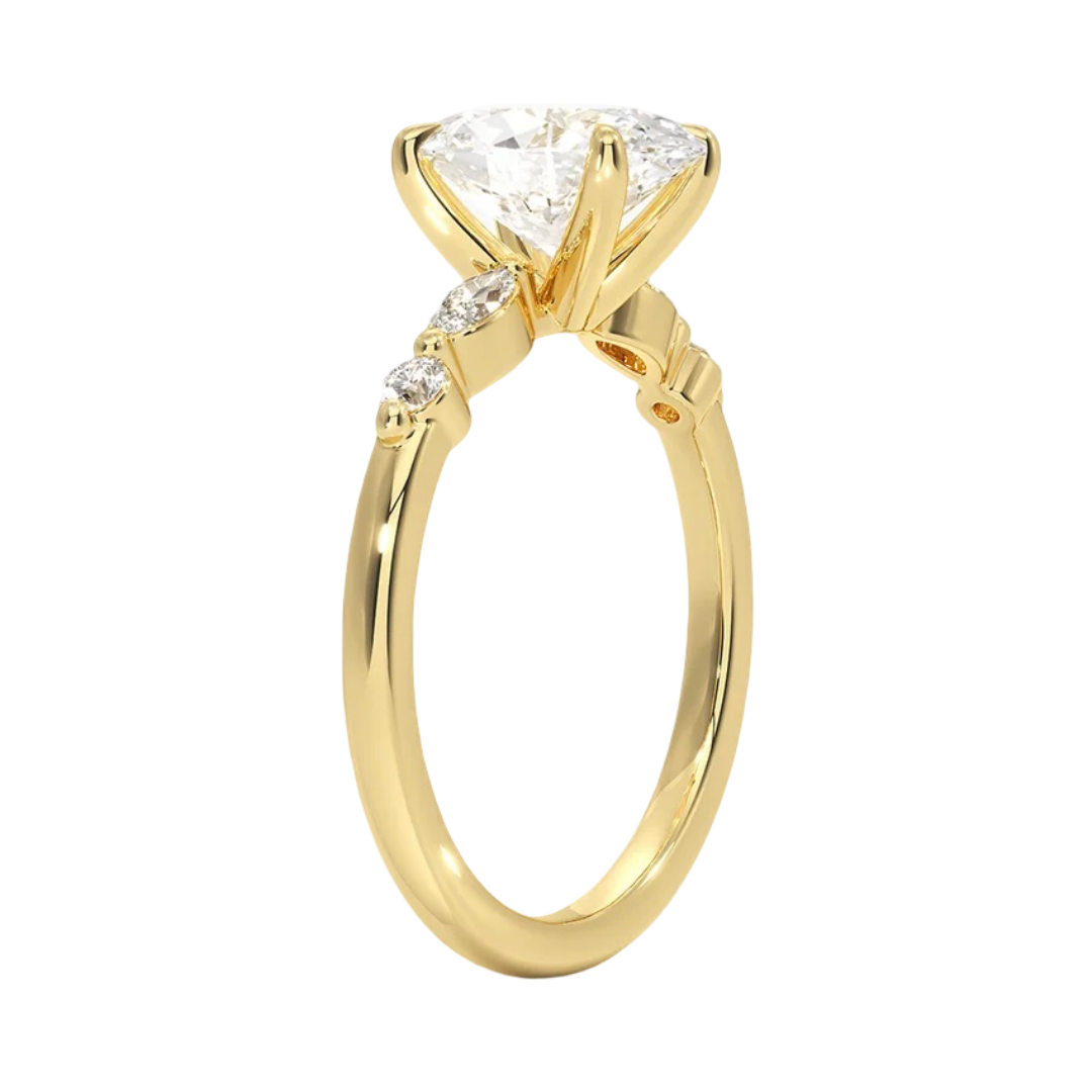 A stunning expression of love, this engagement ring features elegant marquise- and round-cut accent diamonds set in a shimmering array around the center stone. Crafted in radiant 18K yellow gold, this ring blends timeless beauty with warm, luxurious charm.