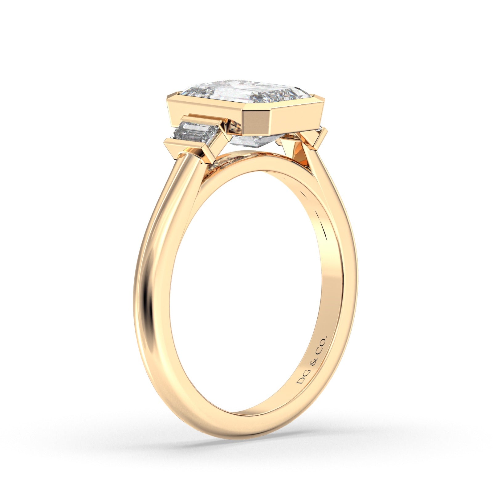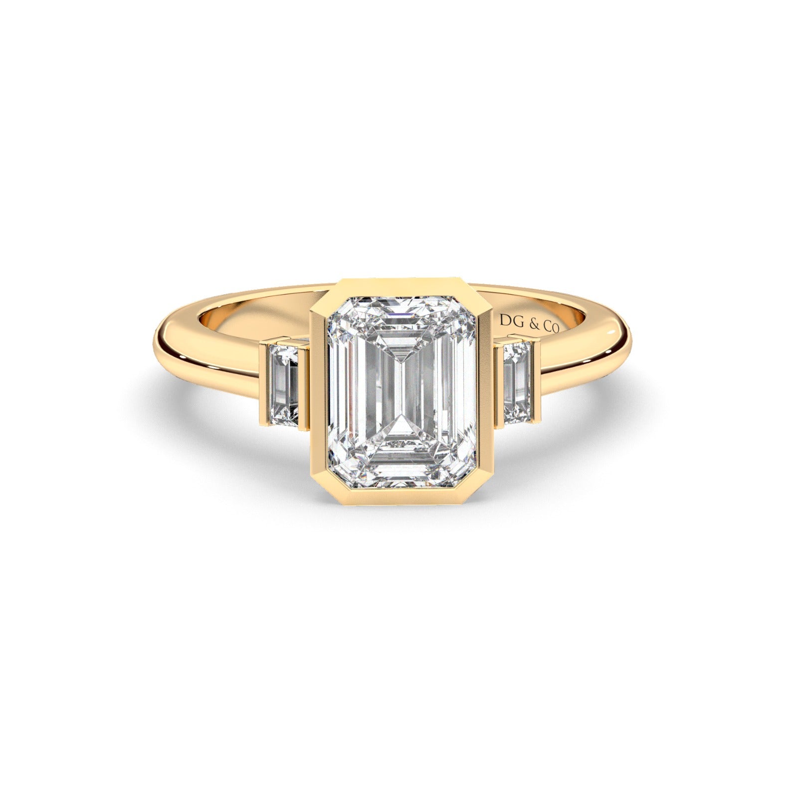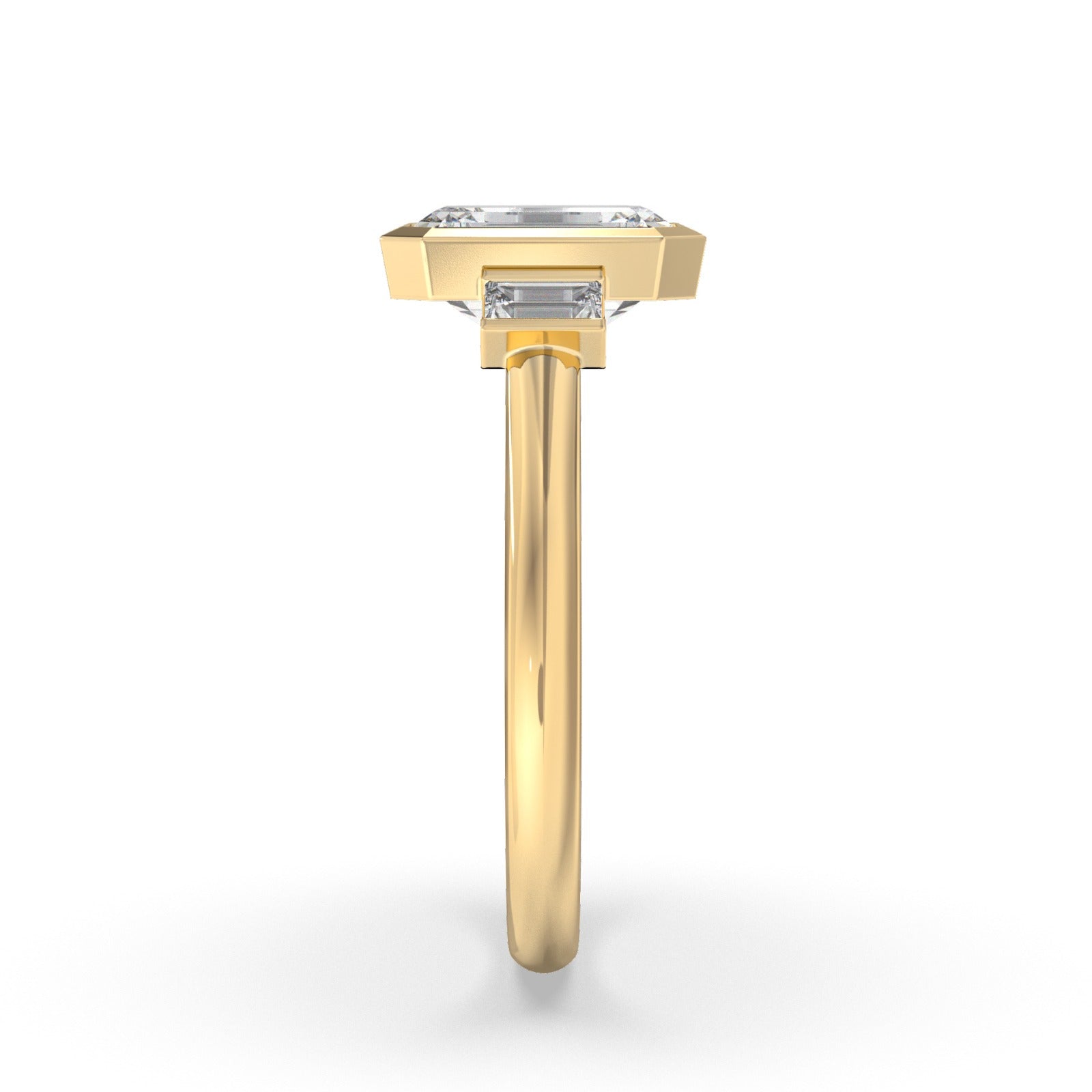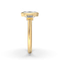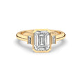 Capture your true love's heart with this timeless engagement ring featuring two elongated emerald-shaped cut bezel set side stones.
