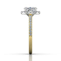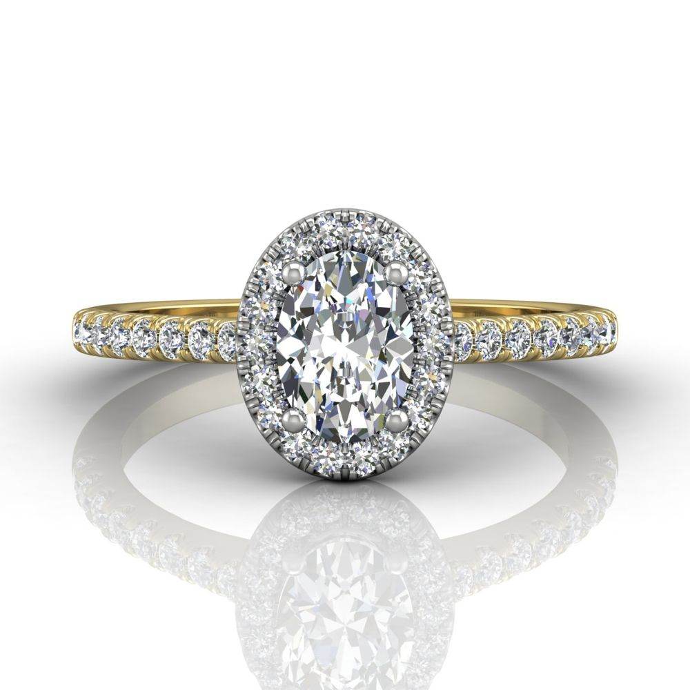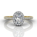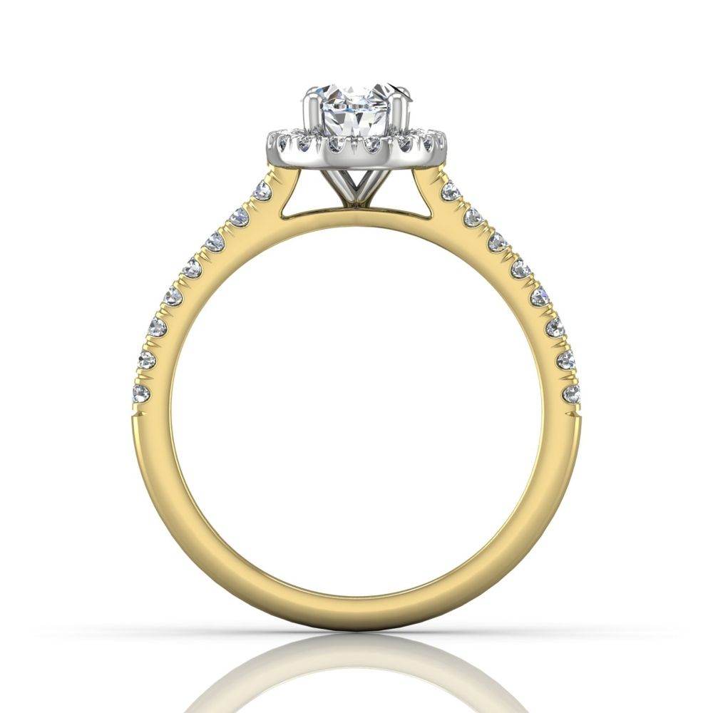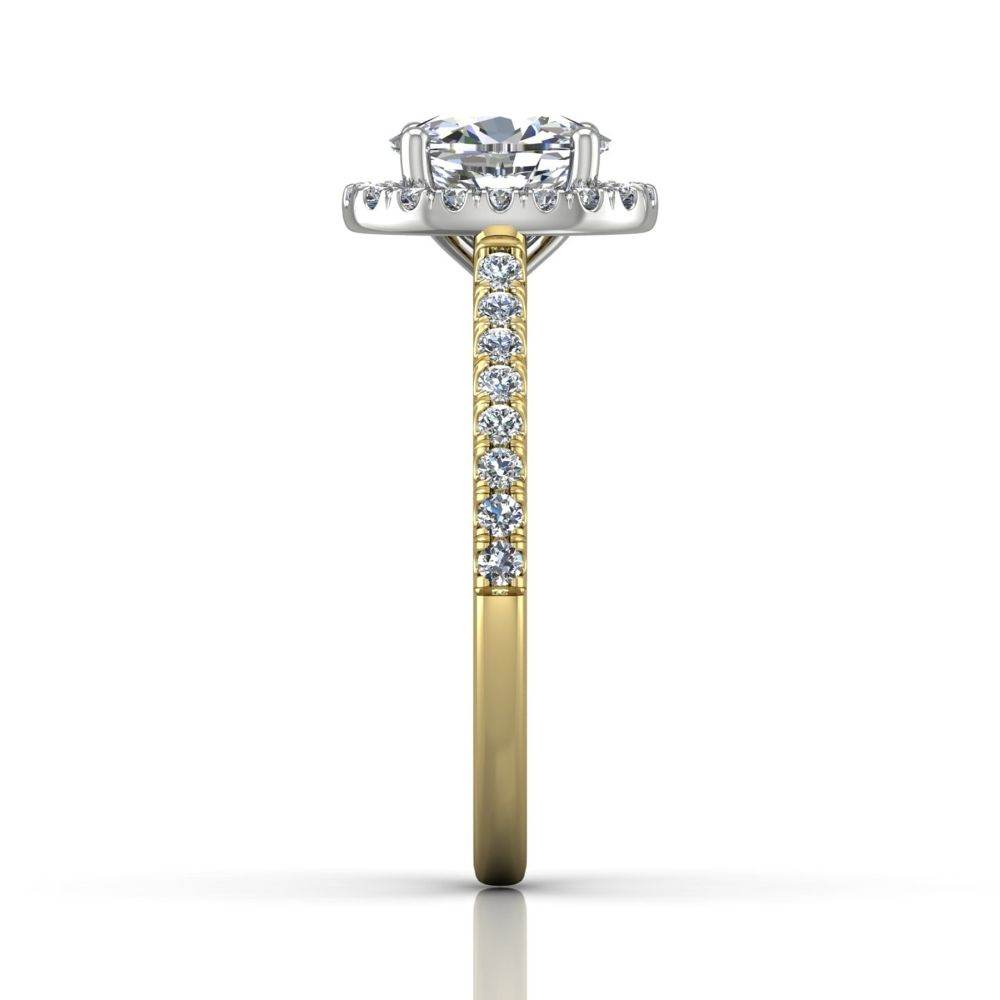 Create a breathtaking moment with this decadent engagement ring, showcasing a diamond laden shank and halo, deftly framed against immaculate 18k yellow and white gold.