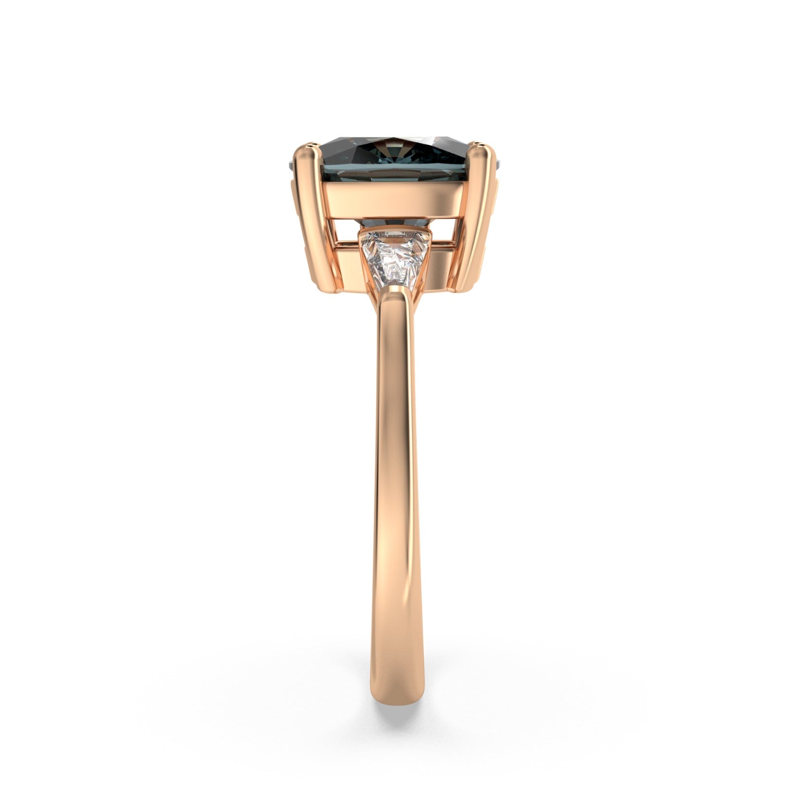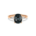 A gorgeously dark royal blue sapphire oval cut takes centre stage in this stunning ring, with a tapered baguette accent diamond on either side of it. It is crafted in warmly lustrous 18k gold to complete the elegant effect.
