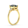 A gorgeously dark royal blue sapphire oval cut takes centre stage in this stunning ring, with a tapered baguette accent diamond on either side of it. It is crafted in warmly lustrous 18k gold to complete the elegant effect.
