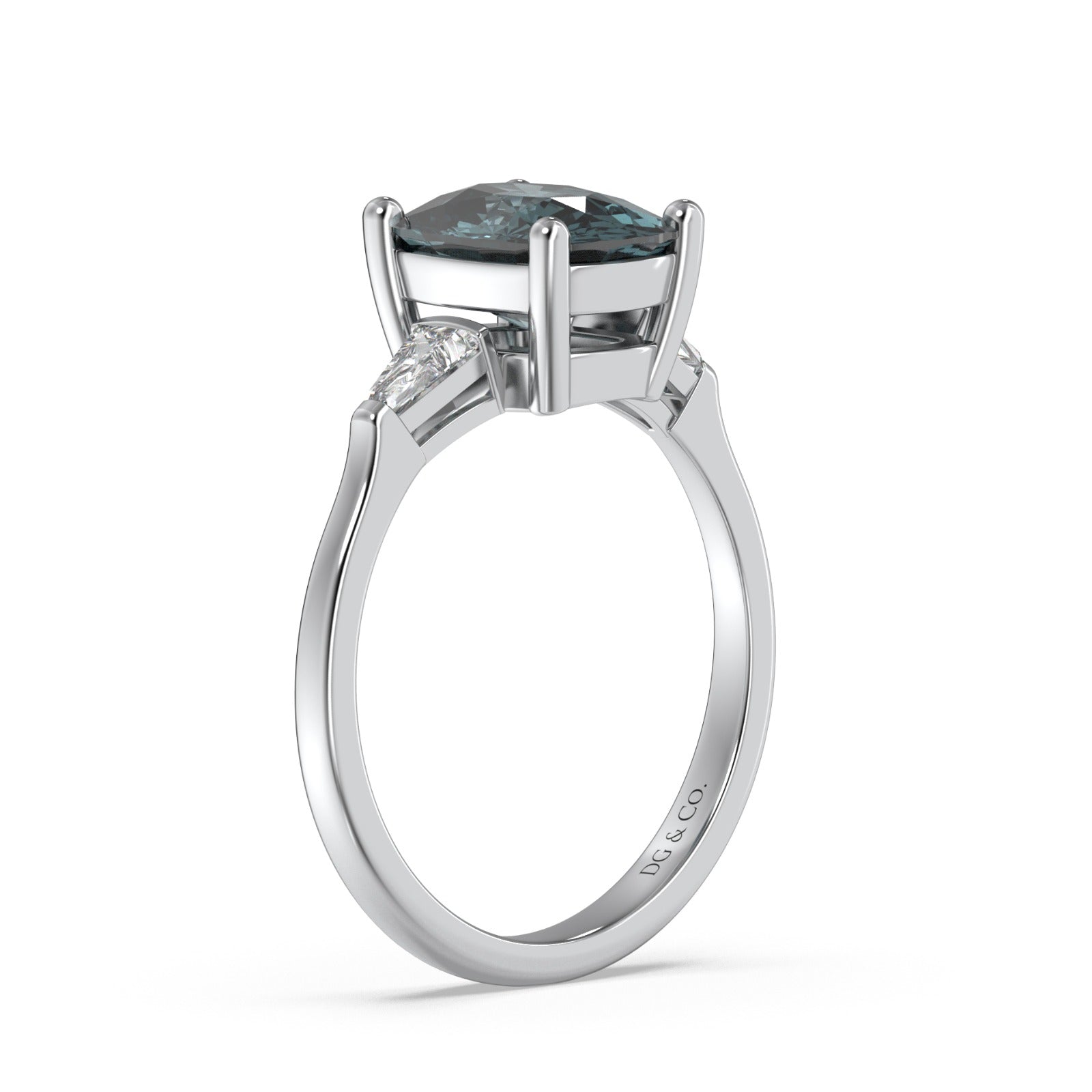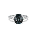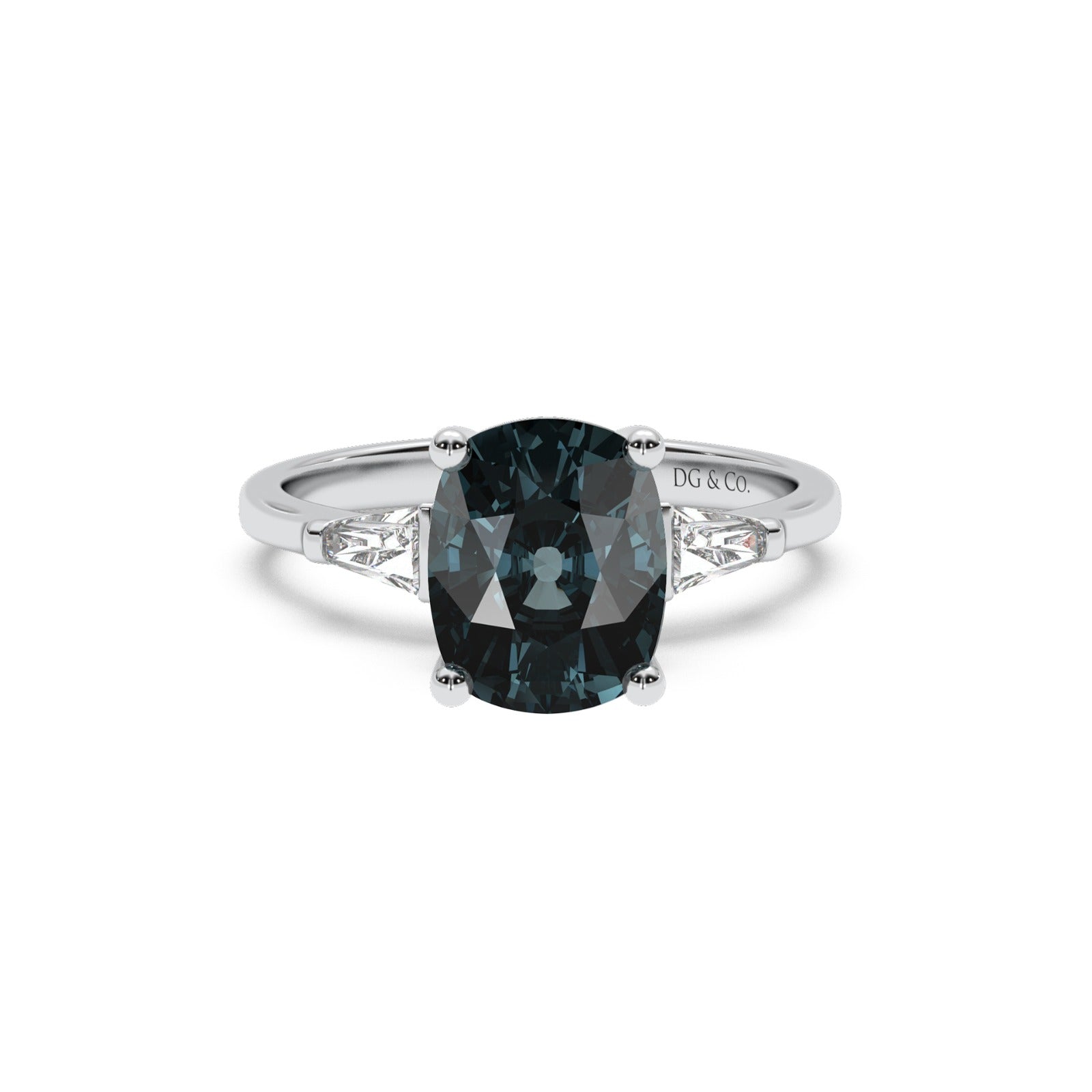 A gorgeously dark royal blue sapphire oval cut takes centre stage in this stunning ring, with a tapered baguette accent diamond on either side of it. It is crafted in warmly lustrous 18k gold to complete the elegant effect.