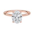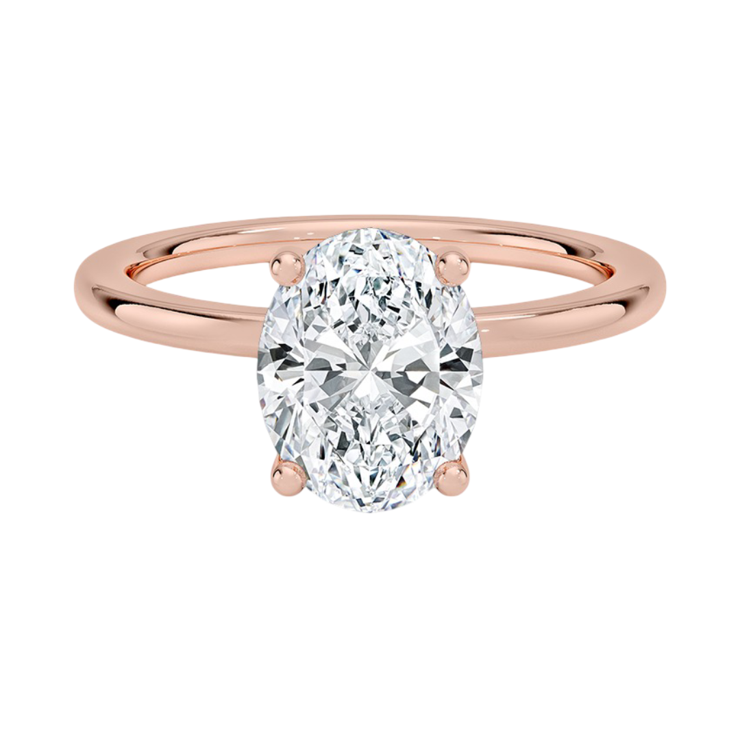 A sleek and streamlined solitaire engagement ring provides a hidden halo, and a clean-cut backdrop for the oval cut diamond center stone. At the apex of a straight shank.