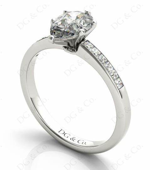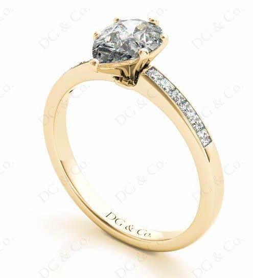 Diamond Engagement Ring with Pear cut diamond in six Claws Setting with twelve princess channel Set diamonds in to the band.