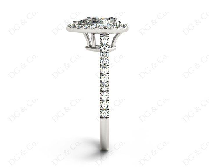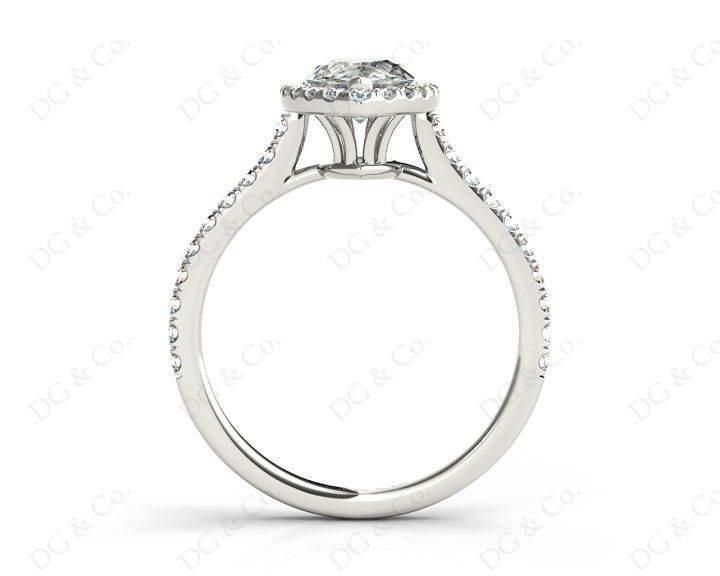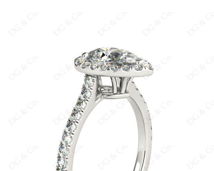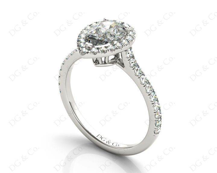 Halo Diamond Engagement Ring with Pear Cut Diamond in Four Claws Setting with Thirty-nine Round Brilliant Pave Setting around the Centre Stone and Down the Shoulders.