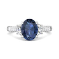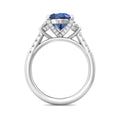 Elegantly refined, this sapphire gemstone and diamond ring showcases an oval cut sapphire complemented by two matching half moon cut diamonds pave setting on the band and set in enduring platinum.