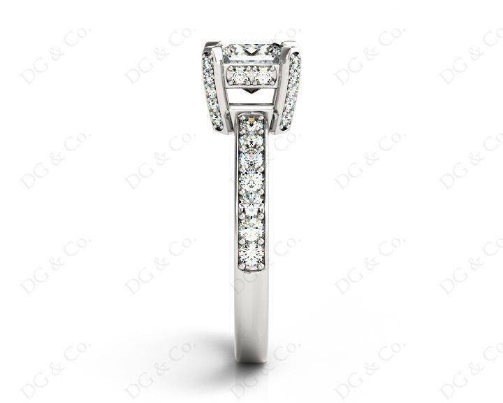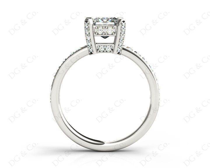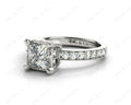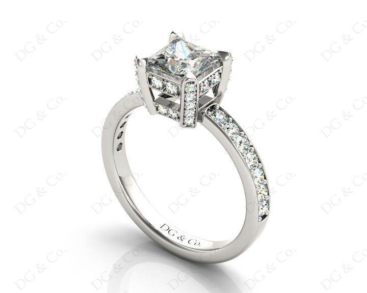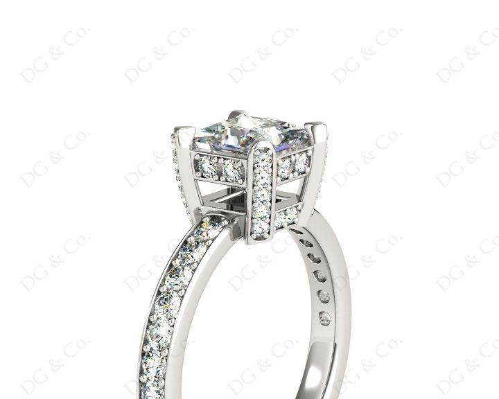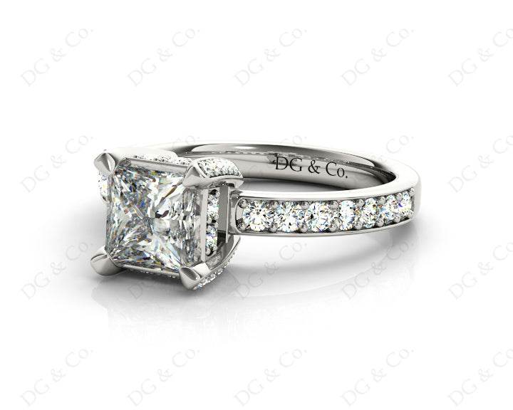 Diamond Engagement Ring with Princess Cut Diamond in Four Prongs Setting with Forty-Six Round Brilliant Channel Set in to the Prongs and Down the Shoulders.