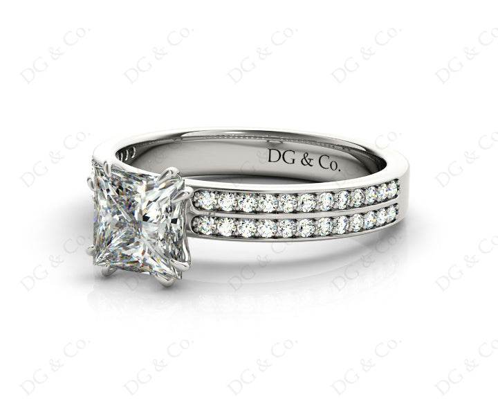 Diamond Engagement Ring with Princess Cut diamond in Split Claw Prong Setting with Forty-eight Round Brilliant Pave Setting Down in to the Shoulders.
